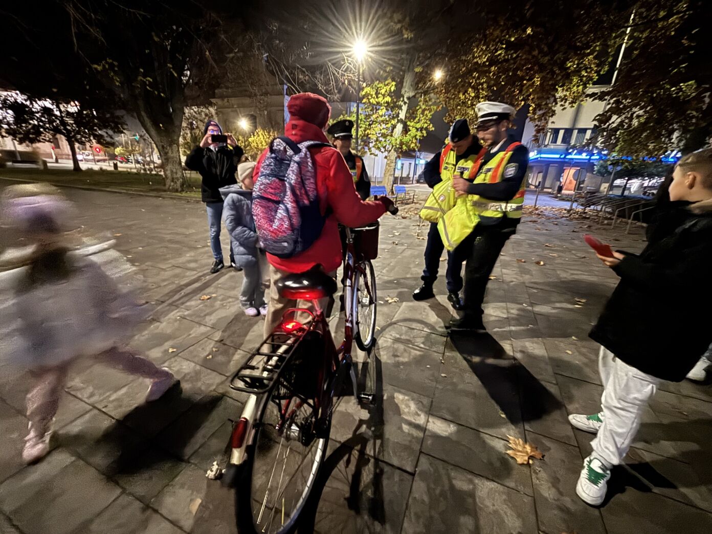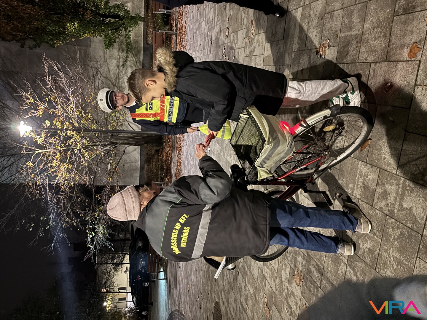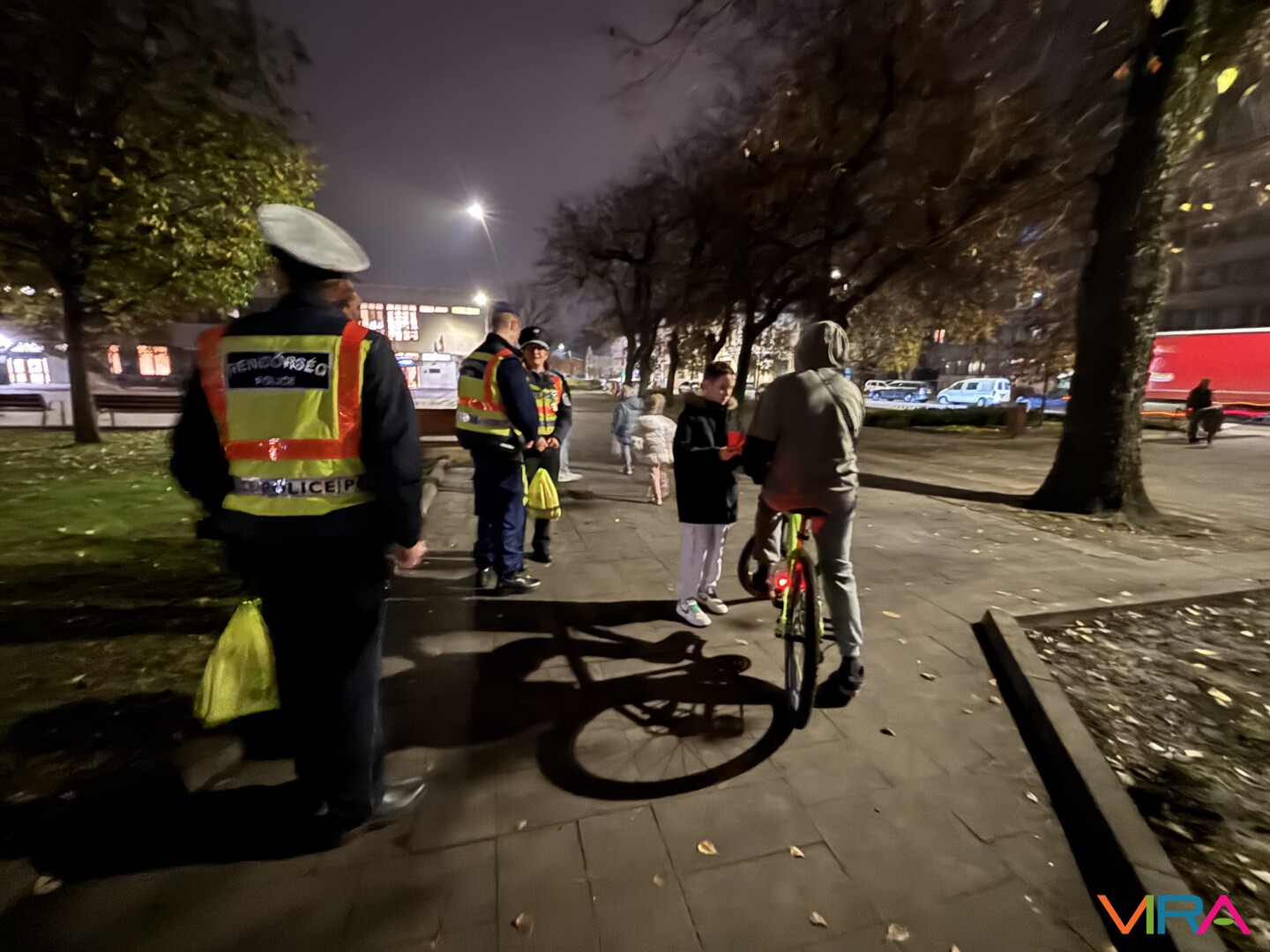 A rendőrök lámpákat, láthatósági mellényeket, fényvisszaverős karkötőket és kulcstartókat osztottak, a BEM EGYLET tagjai pedig csokit és kedves idézeteket ajándékoztak a bringásoknak – hogy az este mosollyal érjen véget.