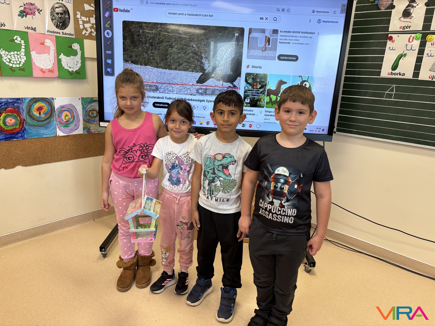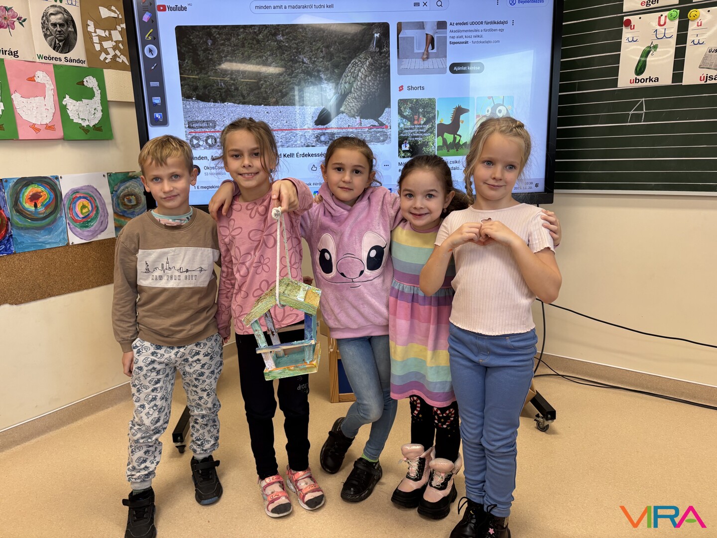 A program nem állt meg az elméletnél: a gyerekek különböző madárfajokat ismertek fel, beszélgettek ragadozó és növényevő madarakról, majd saját madáretetőt készítettek.