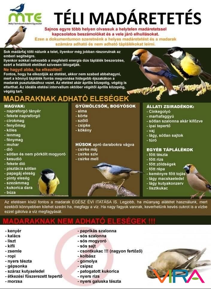- mi kerülhet a madáretetőbe, és mi az, amit szigorúan TILOS adni (például a sós szalonnát, amely kiszáradást okozhat),