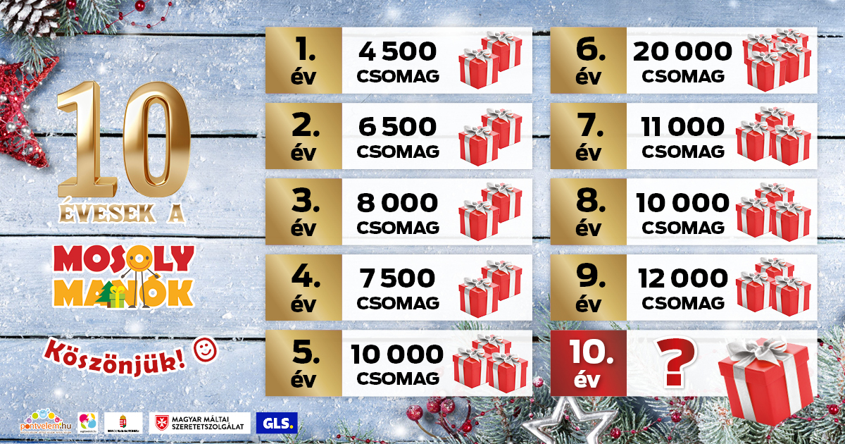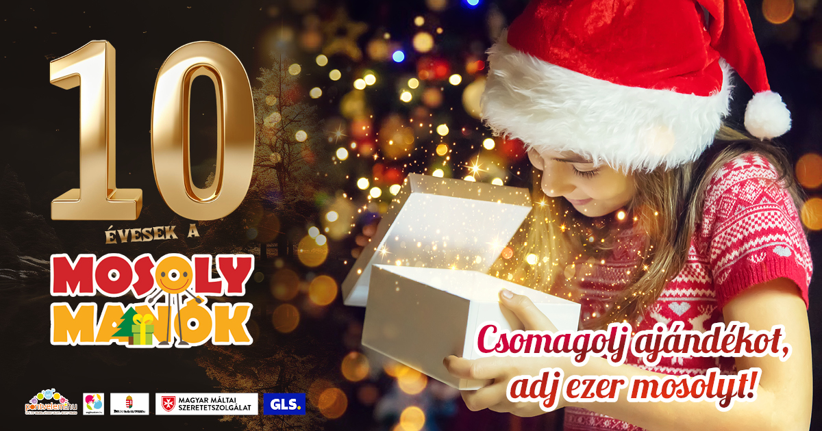 Tíz éve szervezi a PontVelem Okos Program, a Magyar Máltai Szeretetszolgálat és a GLS Hungary Csomaglogisztikai Szolgáltató a karácsonyi MosolyManók adománygyűjtő akciót. Az első kilenc év során 947 általános iskola diákjai csatlakoztak az ország legnagyobb iskolai adománygyűjtéséhez és összesen mintegy 90 ezer ajándékcsomagot ajánlottak fel a rászoruló gyerekek számára. Az idén tízéves programban december 10-ig várják a rászoruló családok gyermekeinek szánt karácsonyi ajándékokat. A csomagokat az iskolákban és a Máltai Gyűjtőpontokon lehet leadni, az akció az adomanyozz.hu oldalon keresztül is támogatható.