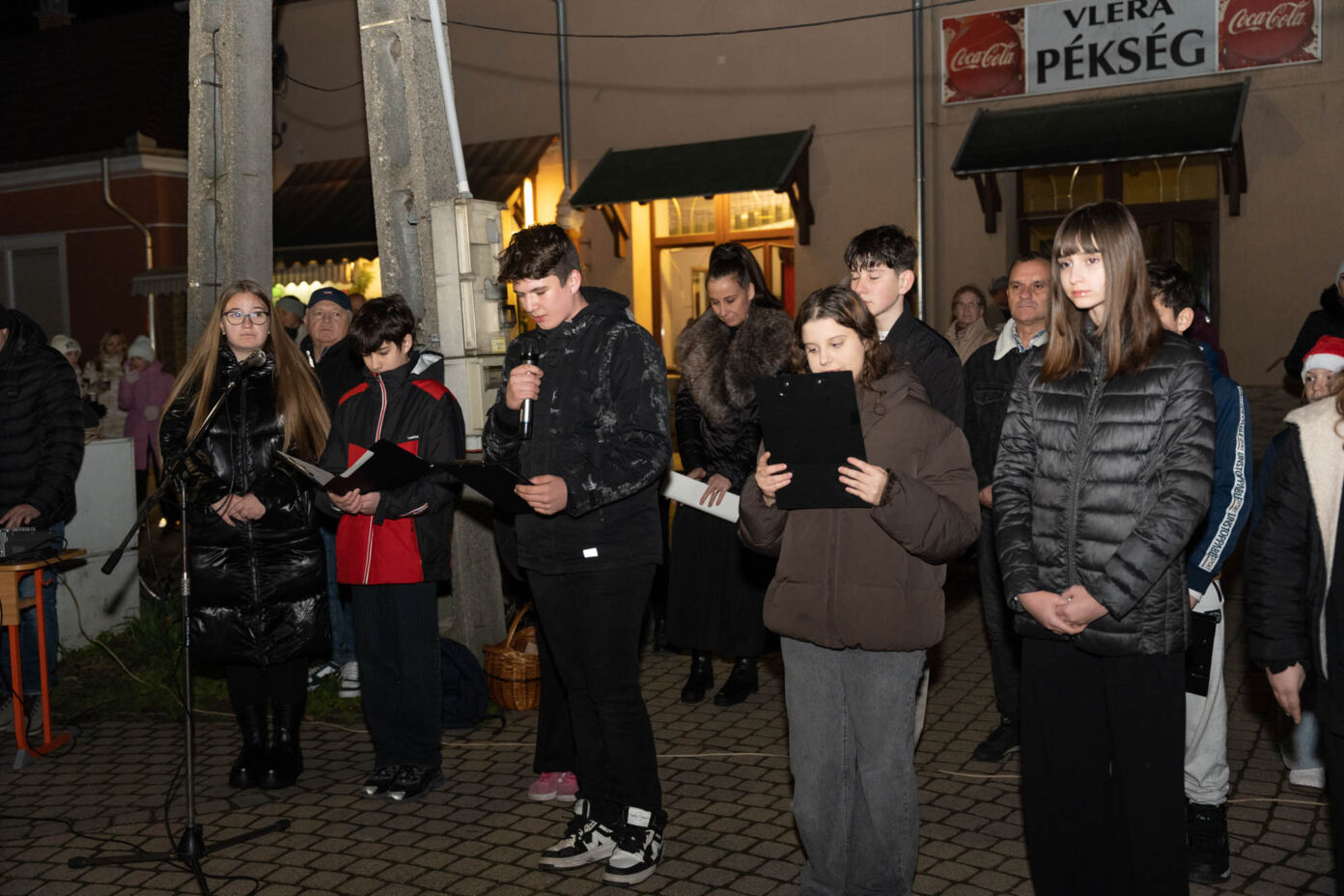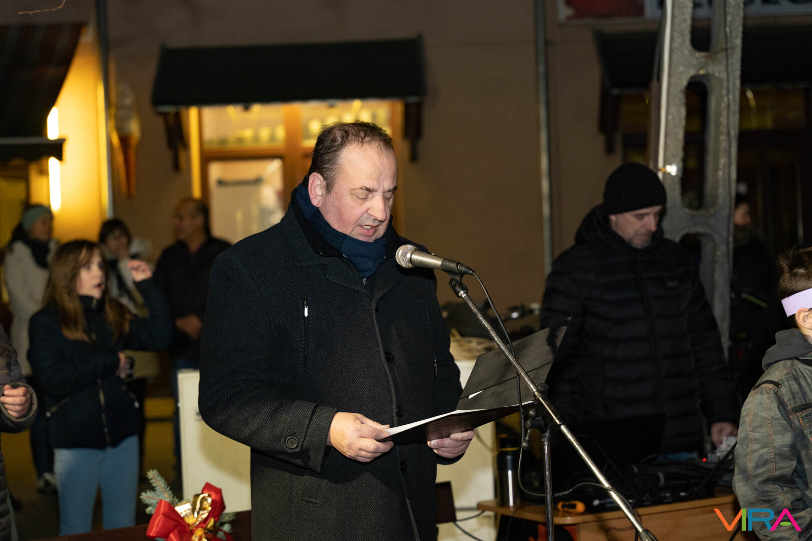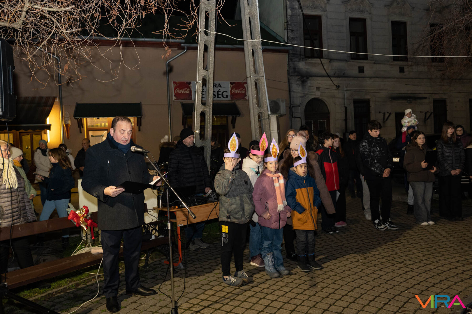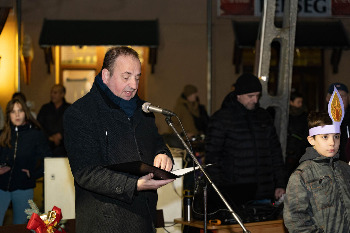 Ezt követően Tetézi Lajos, a rendezvény hosszú évek óta házigazdája köszöntötte a megjelenteket. Felidézte, hogy milyen különleges érzés látni, hogy 18. éve a főtér minden évben közösségi összefogásból születik újjá. Mint mondta, az idei látvány talán minden eddiginél szebb: a karácsonyfa, a jászol, a rénszarvasszán, az óvodások installációi és a fények mind-mind azt üzenik: van remény, és van még bennünk erő, hogy együtt tegyünk valami szépet.
