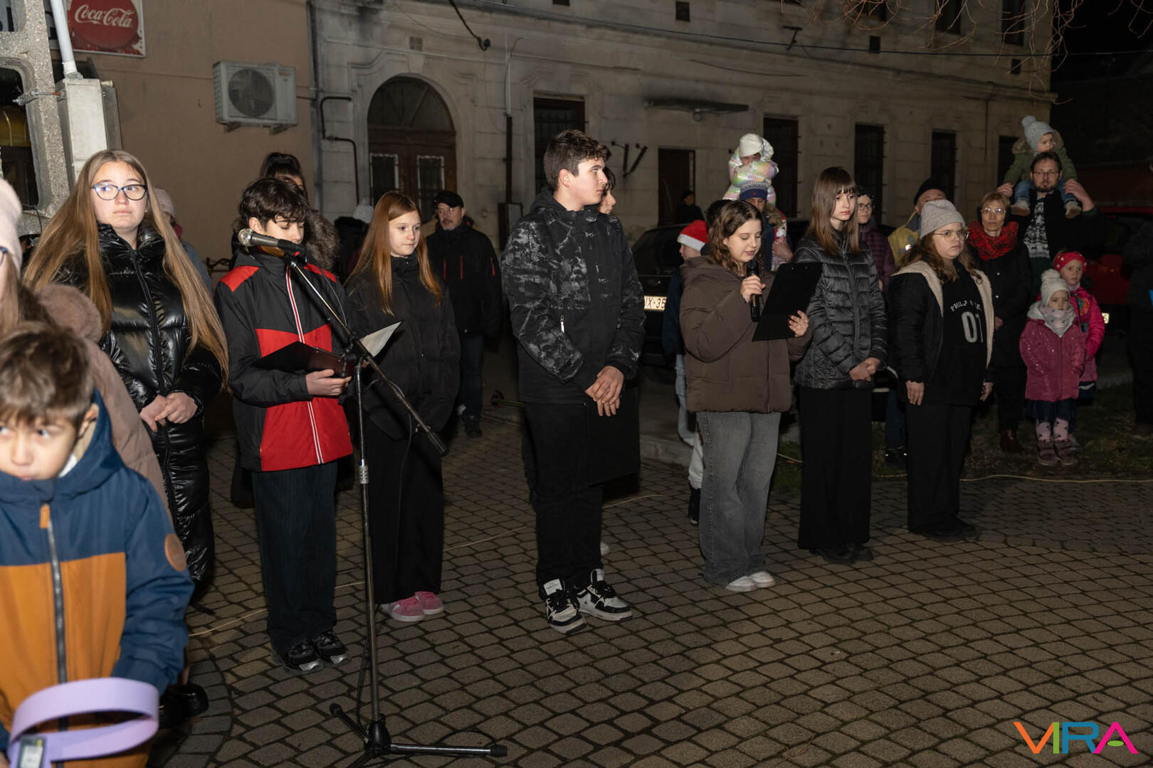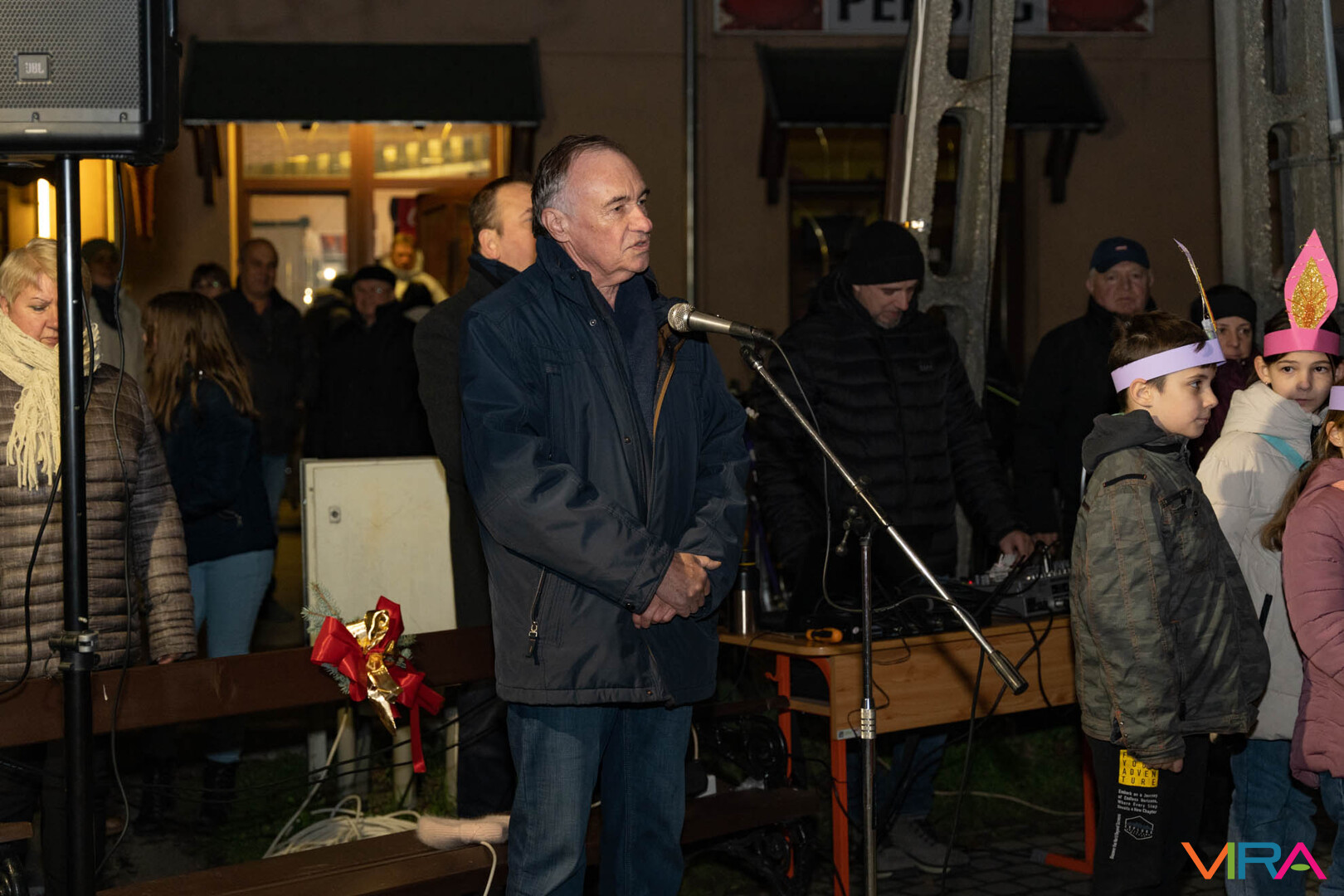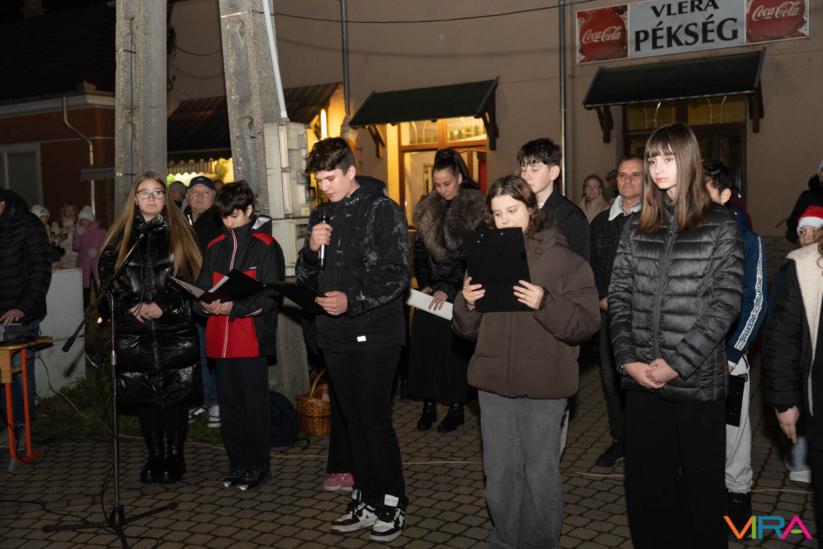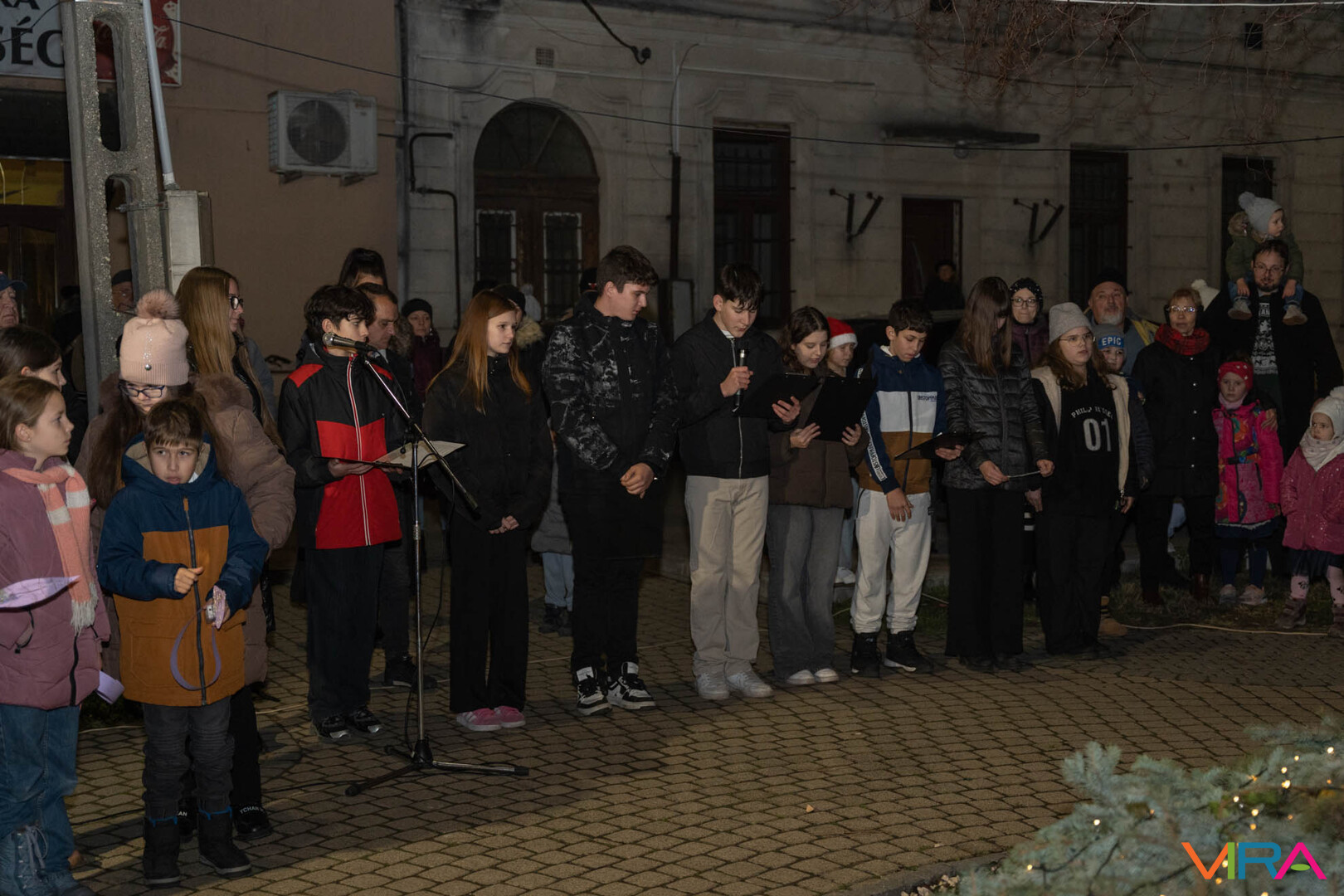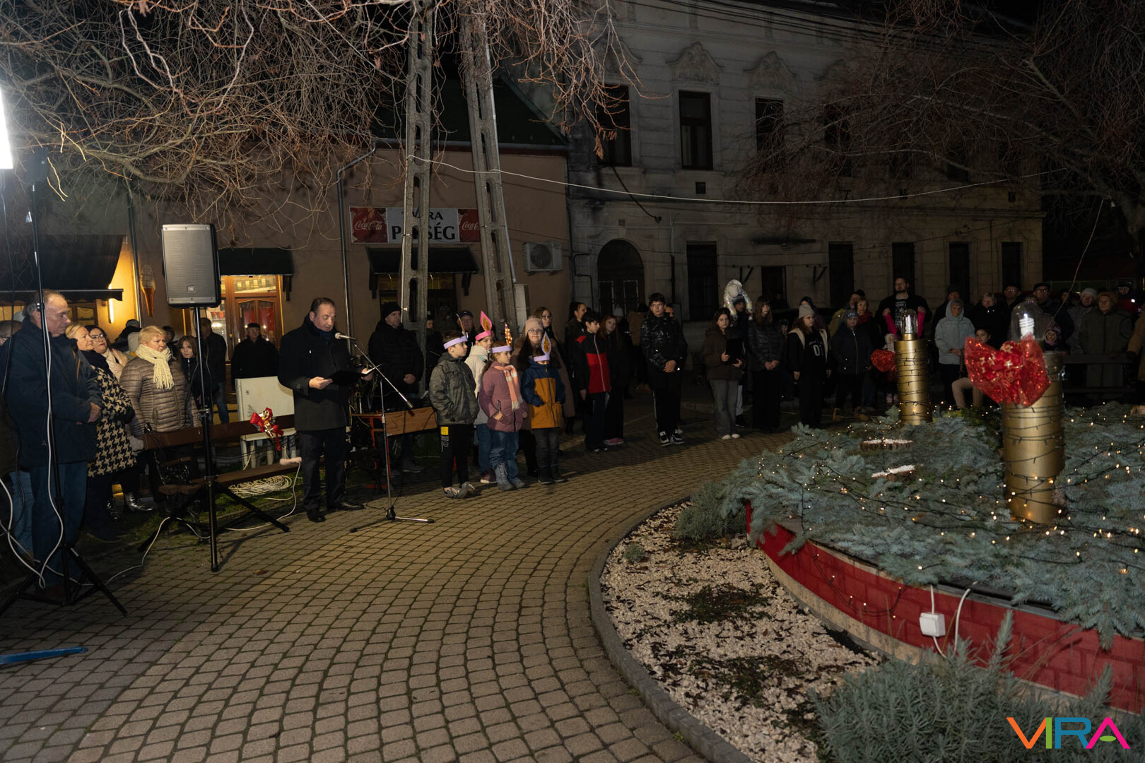 Ezt követően Tetézi Lajos, a rendezvény hosszú évek óta házigazdája köszöntötte a megjelenteket. Felidézte, hogy milyen különleges érzés látni, hogy 18. éve a főtér minden évben közösségi összefogásból születik újjá. Mint mondta, az idei látvány talán minden eddiginél szebb: a karácsonyfa, a jászol, a rénszarvasszán, az óvodások installációi és a fények mind-mind azt üzenik: van remény, és van még bennünk erő, hogy együtt tegyünk valami szépet.