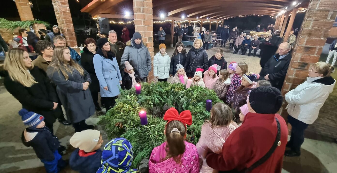 A gyertyagyújtáshoz a koszorú köré gyűltek az óvodások, az iskolások és a két intézmény dolgozói, hogy énekszavukra lángra lobbanjon az első három (hit, remény, öröm) adventi gyertya.