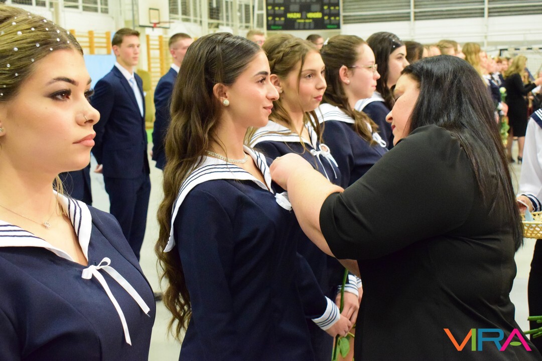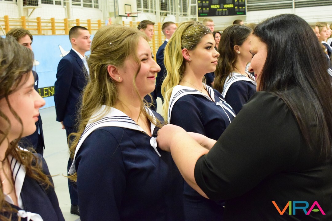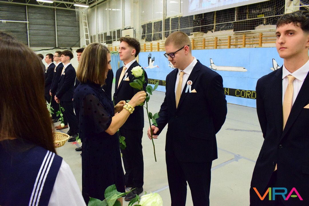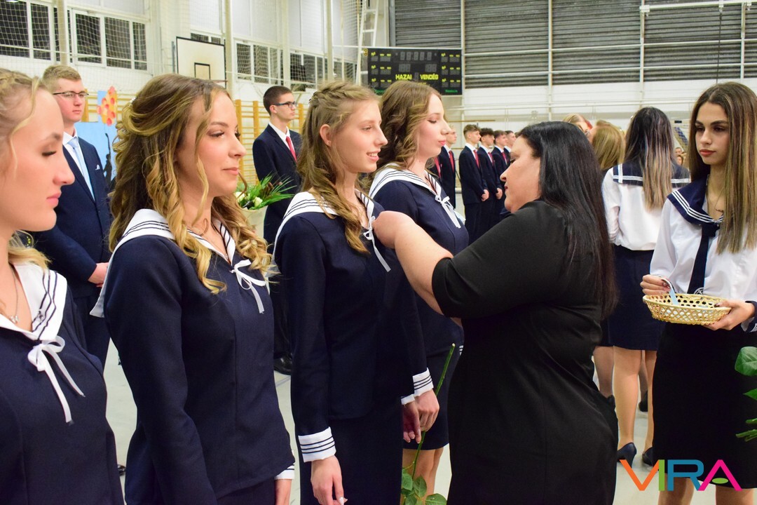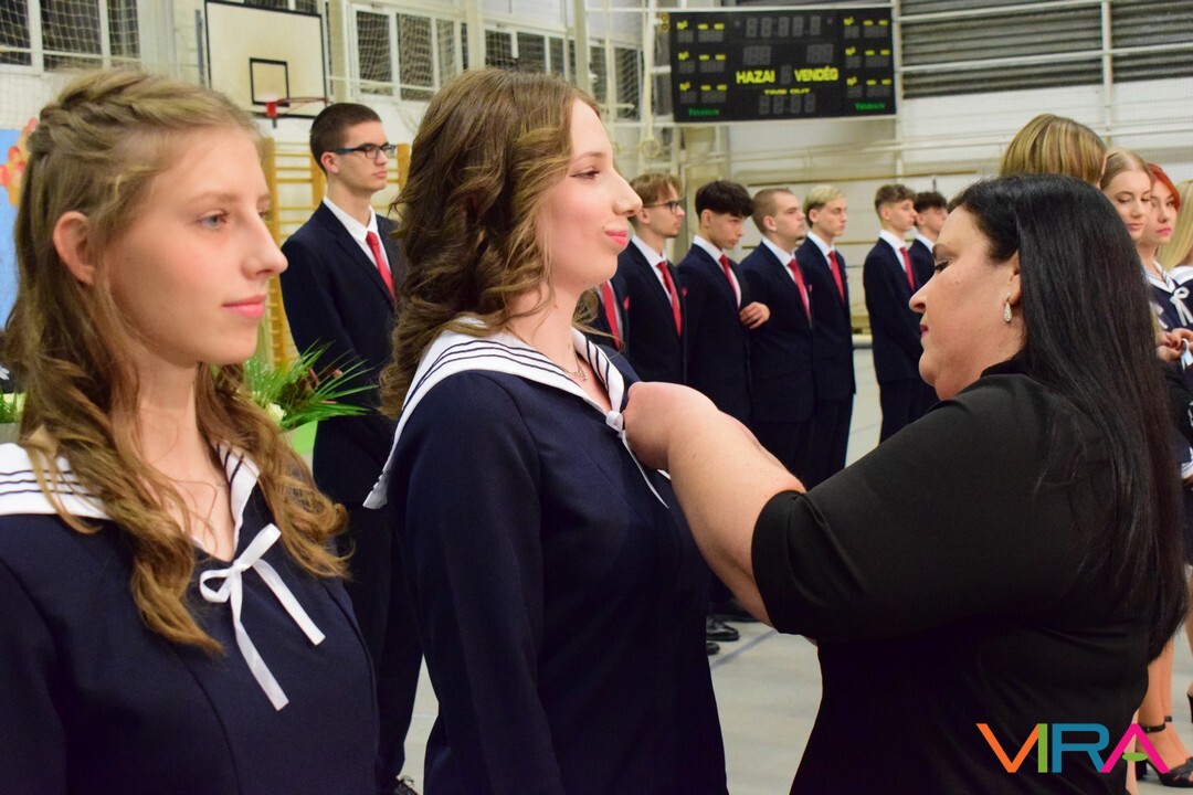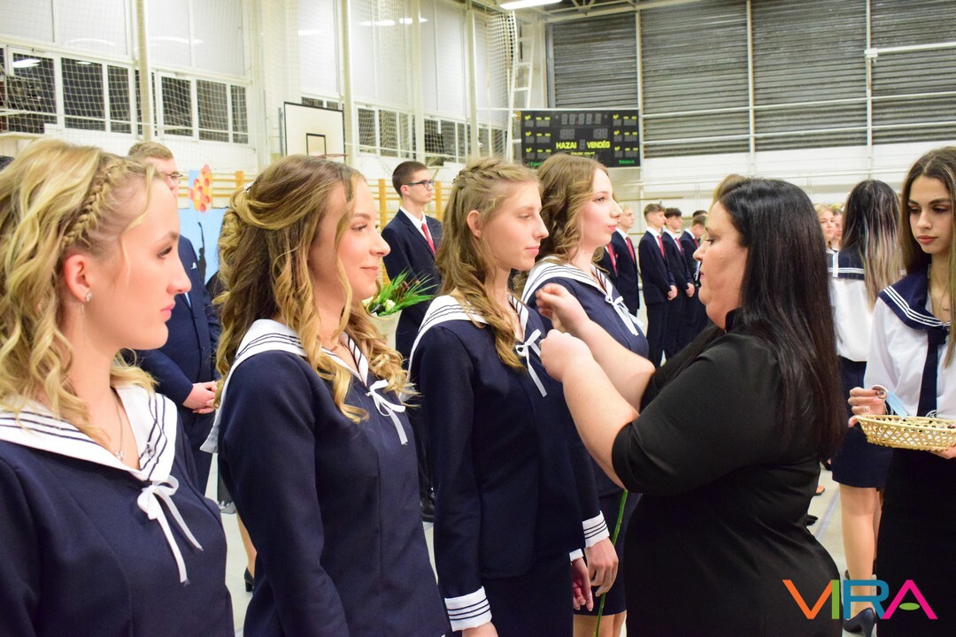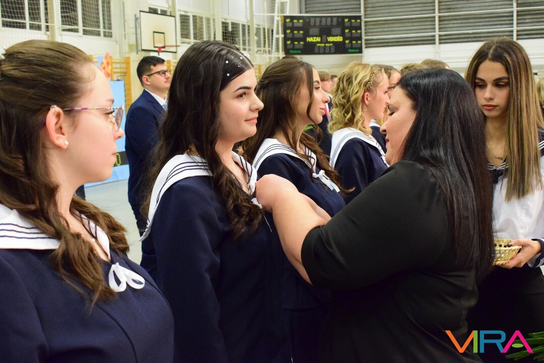 A különleges műsor után Pfeiffer-Dömök Krisztina iskolalelkész osztotta meg köszöntő gondolatait és mondott áldást a végzős diákokra. Ezt követően került sor a szalagtűzésre, melyen jelképesen a végzős diákok osztályfőnökei tűzték fel a szalagot, illetve egy szál fehér rózsát is kaptak a tizenkettedik évfolyamos tanulók. Előbb a 12/C és 12/D osztály szalagtűzésére került sor, majd a 12/A osztályosok kapták meg a szalagot.