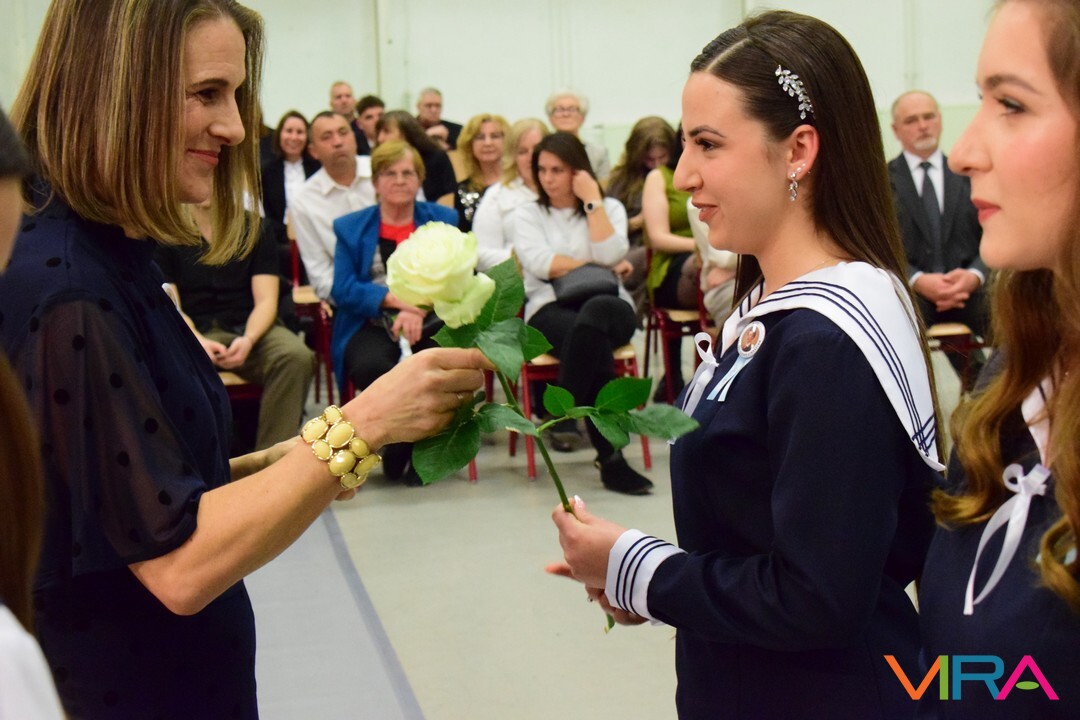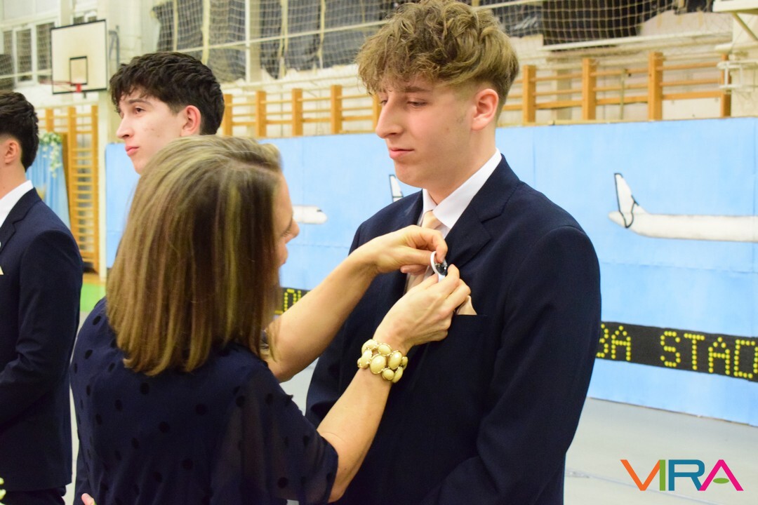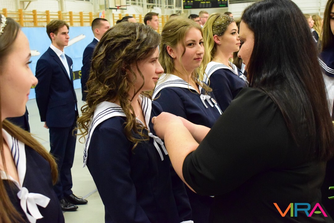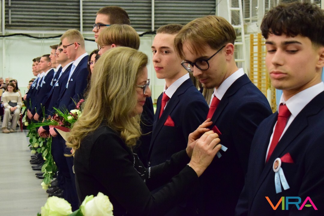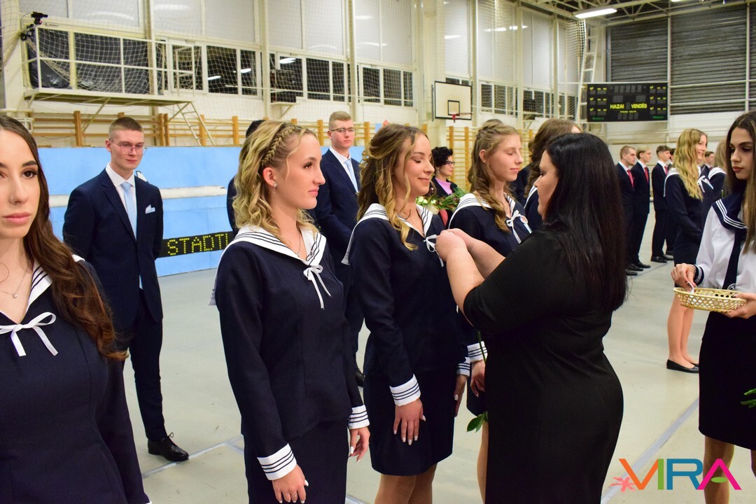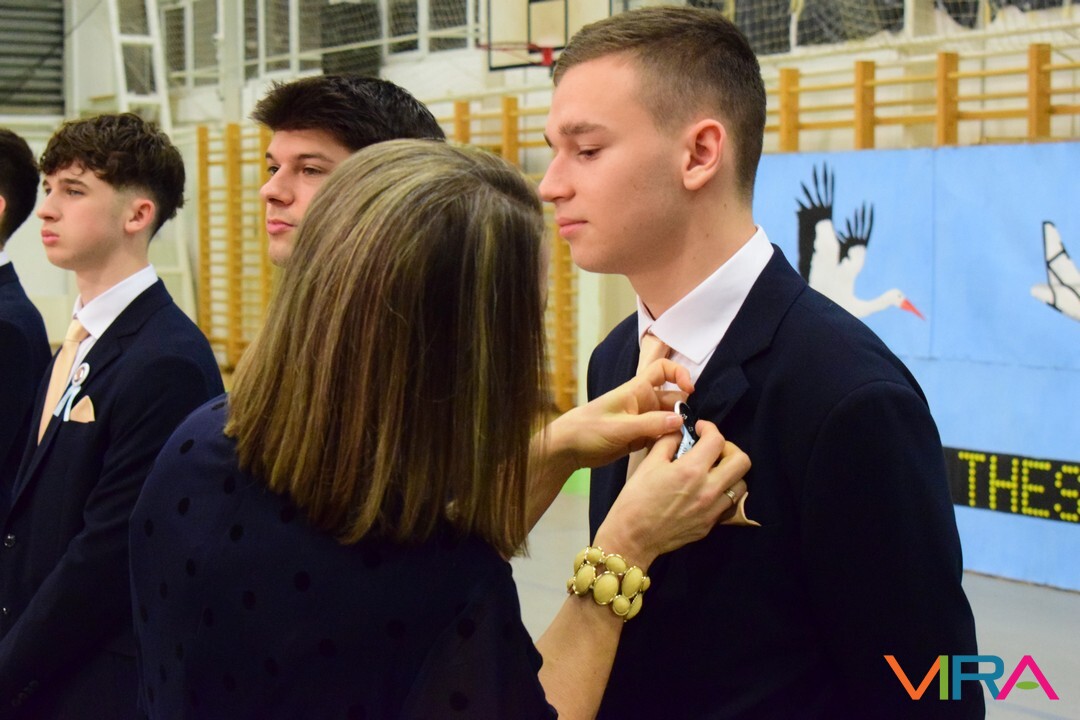 A különleges műsor után Pfeiffer-Dömök Krisztina iskolalelkész osztotta meg köszöntő gondolatait és mondott áldást a végzős diákokra. Ezt követően került sor a szalagtűzésre, melyen jelképesen a végzős diákok osztályfőnökei tűzték fel a szalagot, illetve egy szál fehér rózsát is kaptak a tizenkettedik évfolyamos tanulók. Előbb a 12/C és 12/D osztály szalagtűzésére került sor, majd a 12/A osztályosok kapták meg a szalagot.