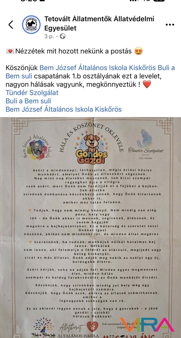 Meg kell érteniük, hogy mi mire épül. Nem elég egyszer egy állatot megmenteni, bár az is óriási dicsőség, és öröm látni, hogy egyre többen így gondolkodnak. De azokhoz is szólni kell, akikre az egész állatvédelem épül egy kis hálával fűszerezve. Mert nem csak a nagy ajándékok érnek célba. Nem mindig a drága dolog a fontos, hanem az, hogy megtanuljunk szívből adni, és hogy olyan generáció nőjön fel, amely érti a köszönet erejét. Az 1.b osztály idén 40 állatvédő szervezetnek köszönte meg a munkáját.