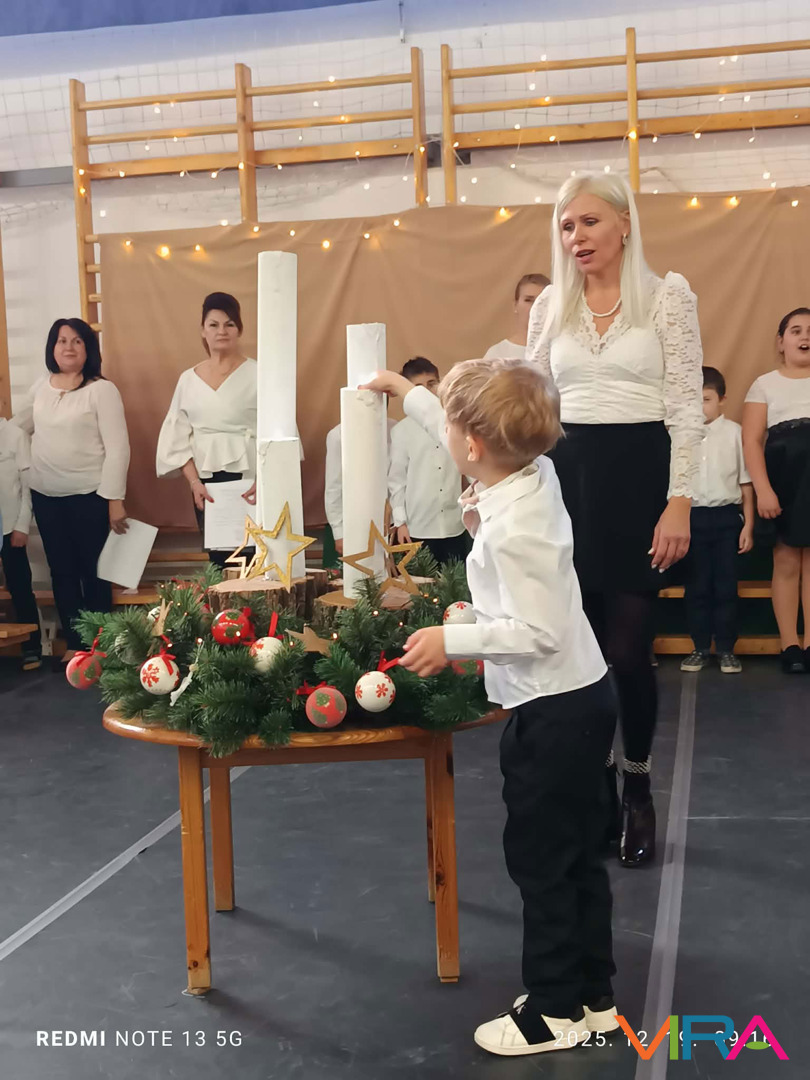 Az alsó tagozatos gyermekek csengettyűjátéka és közös éneke bensőséges, ünnepi hangulatot varázsolt, a műsor pedig maradandó, szívhez szóló élményt adott minden jelenlévőnek… mert négy gyertya ég az adventi koszorún: „Béke, hit, szeretet és remény. Ha együtt égünk, fényt adunk a világnak. Ha a szívetekben is meggyújtjátok a lángunkat, akkor minden nap karácsony lehet.”