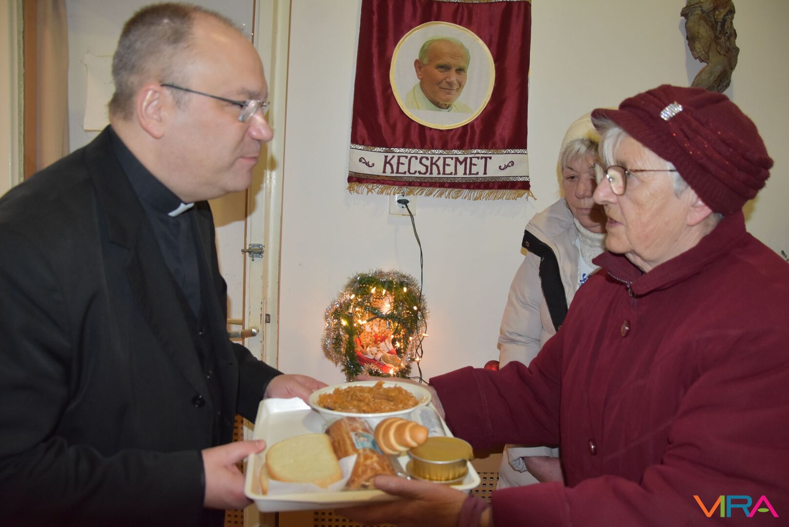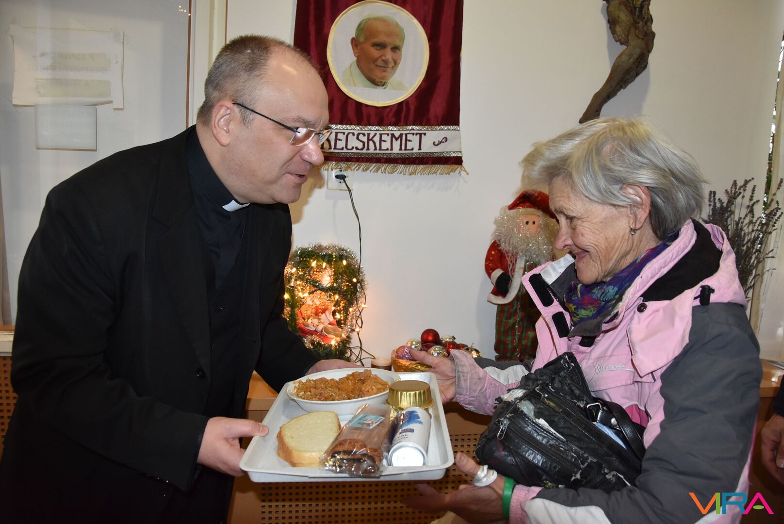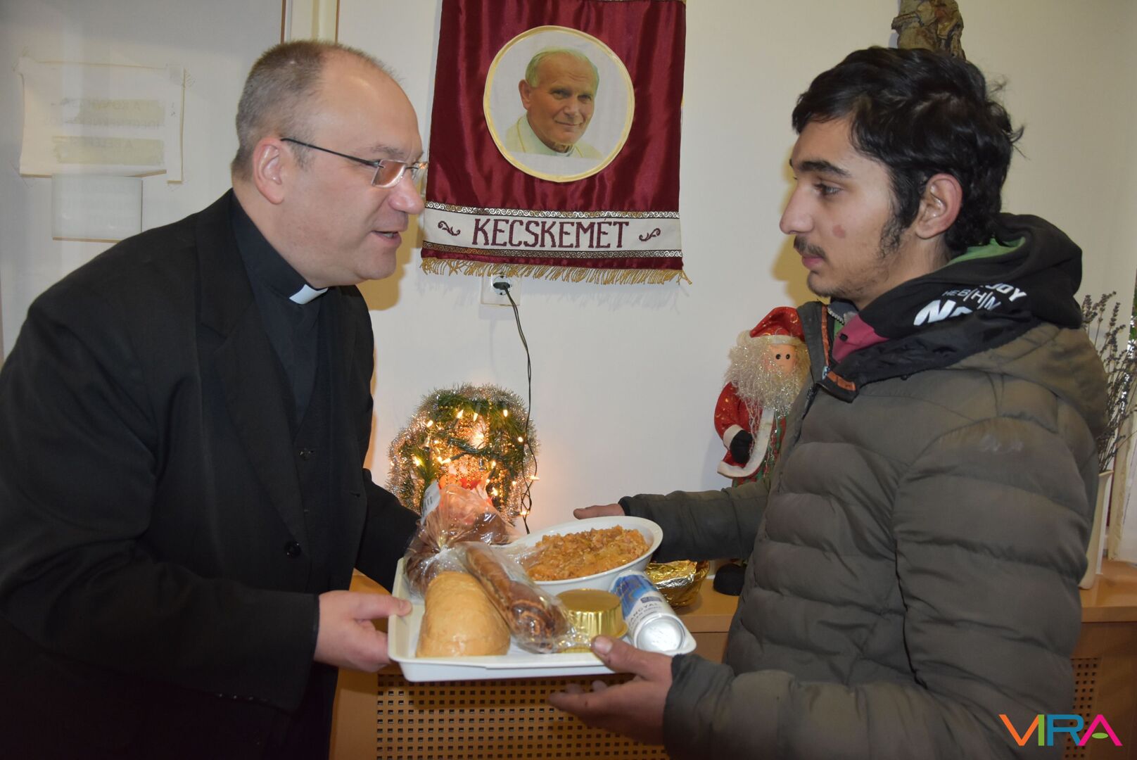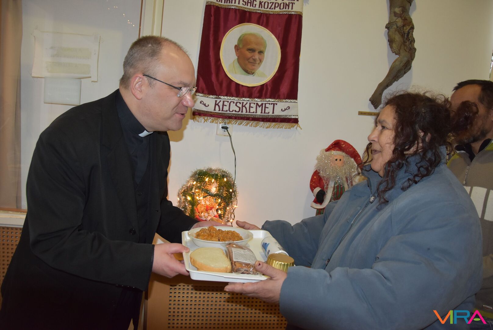 Kuna Lajos és ifjú zenésztársa második hangszeres szolgálatát követően kezdetét vette az ünnepi jótékonysági ebédosztás. A Szentcsalád Plébánia és Fekete Szabolcs atya felajánlásából székelykáposzta került a tányérokra, melyet a karitatív létesítmény önkéntesei szolgáltak fel, Szabolcs atya segítő közreműködésével.