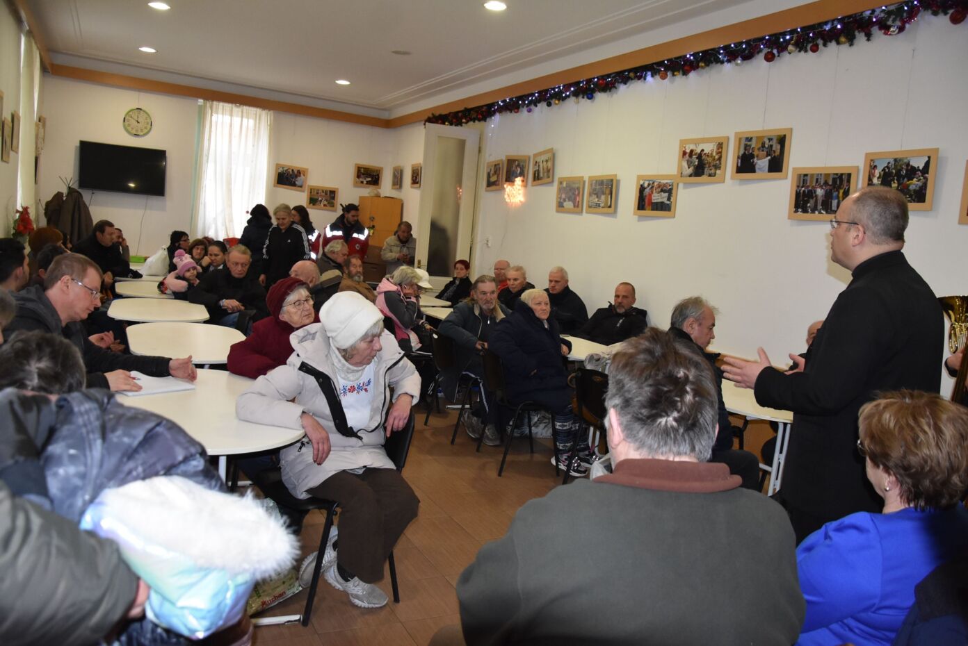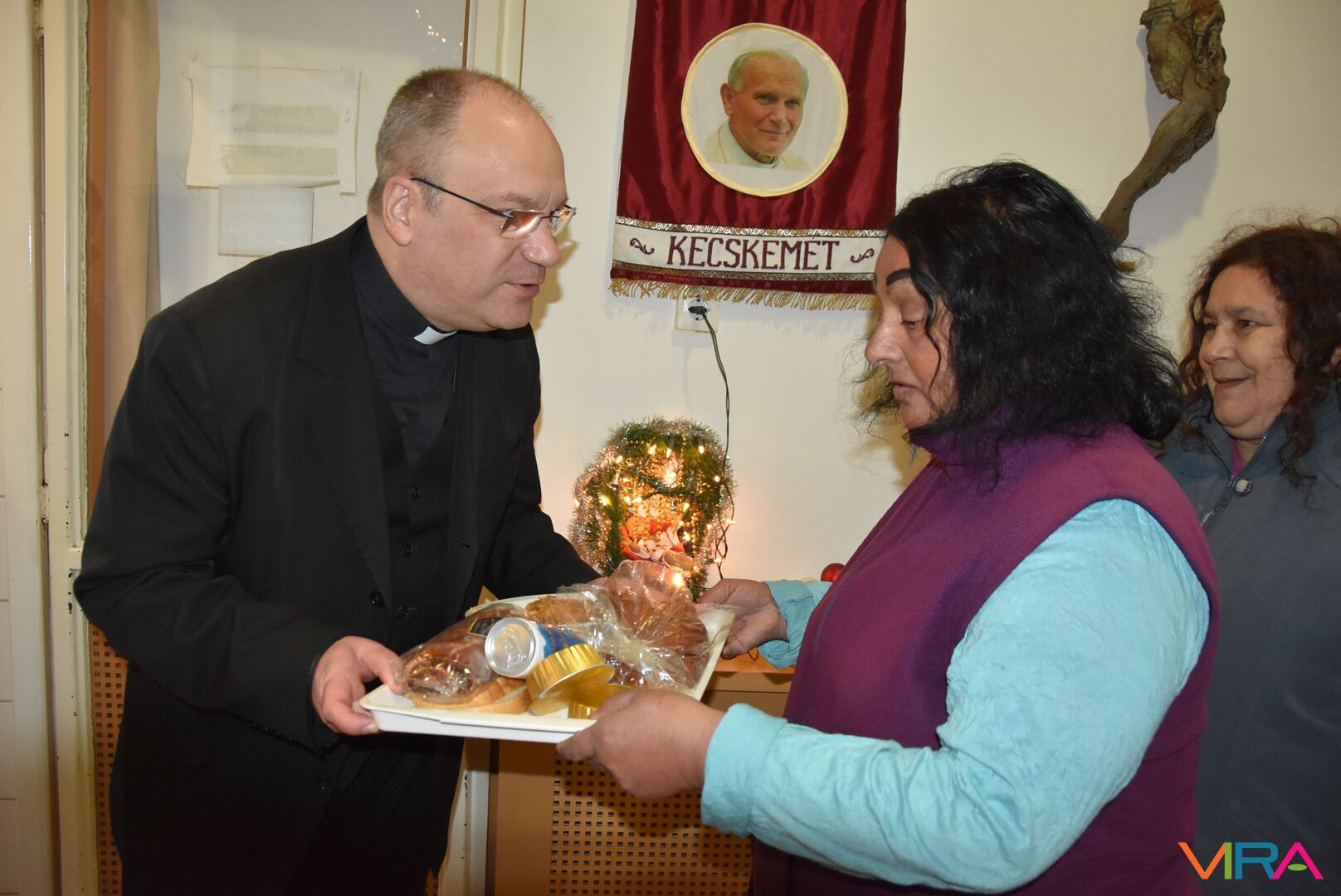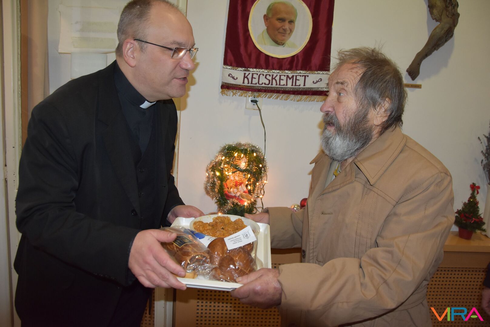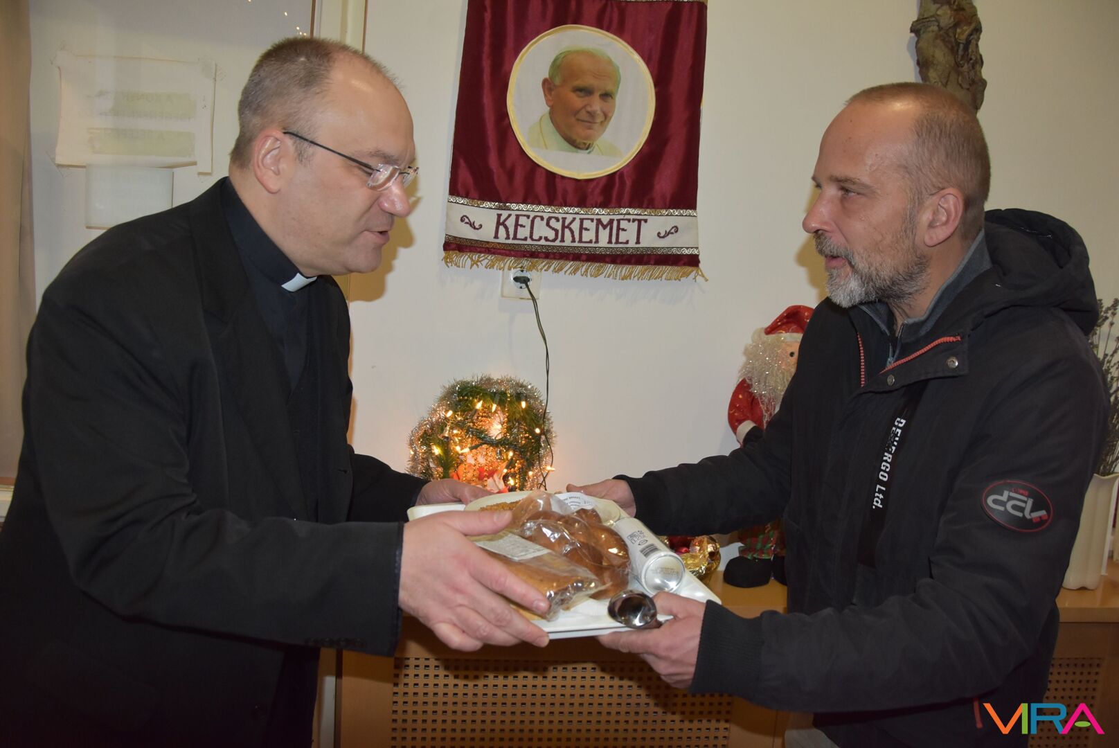 Kuna Lajos és ifjú zenésztársa második hangszeres szolgálatát követően kezdetét vette az ünnepi jótékonysági ebédosztás. A Szentcsalád Plébánia és Fekete Szabolcs atya felajánlásából székelykáposzta került a tányérokra, melyet a karitatív létesítmény önkéntesei szolgáltak fel, Szabolcs atya segítő közreműködésével.