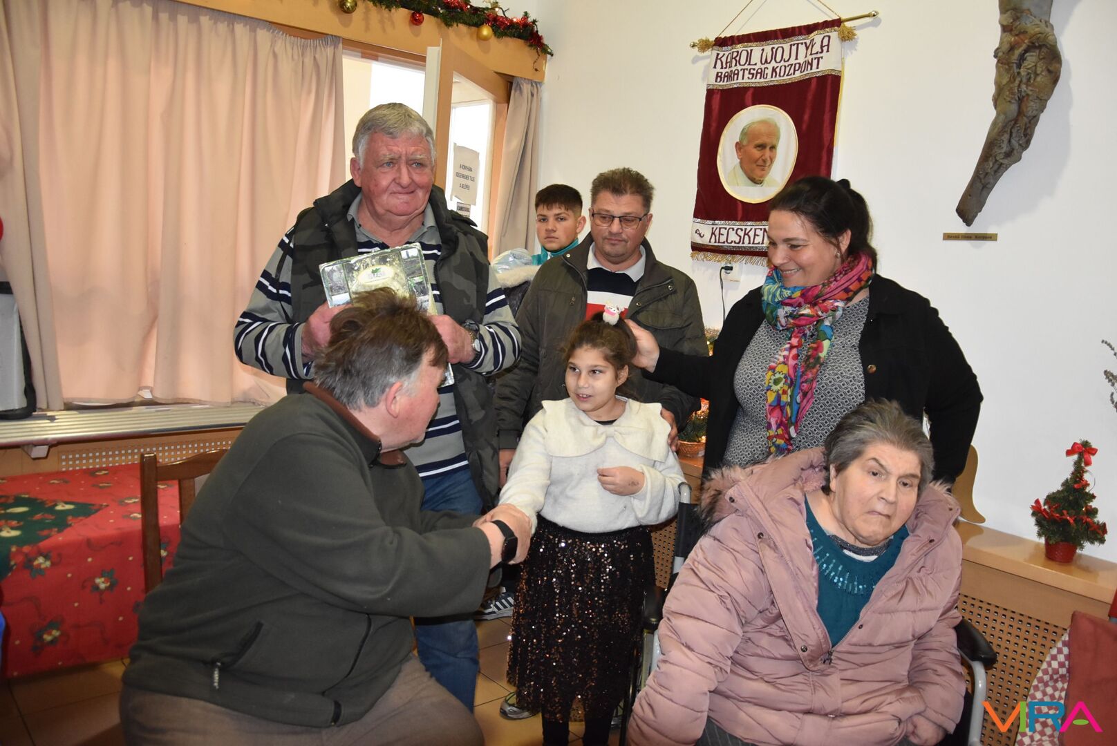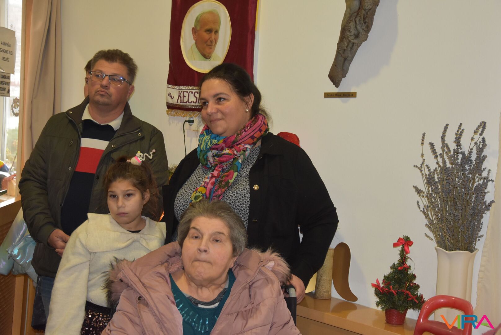 Megható pillanatokkal folytatódott az esemény, amikor egy hölgy lépett elő, tolószékben ülő, stroke-on többször átesett édesanyjával. Elmondta: az idős asszony évekkel ezelőtt agyvérzést kapott, állapota azóta súlyosbodott. A széchenyivárosi Szentcsalád Plébánia hívőközösségéhez tartozó család nemrégiben úgy döntött, az édesanya elektromos kerekesszékét – mivel romló egészségi állapota okán a nagybeteg asszony már nem tudja használni az eszközt – a Wojtyla Barátság Központ javára ajánlják fel, hogy ily módon tegyék könnyebbé egy jobb sorsra érdemes embertársuk mindennapjait.