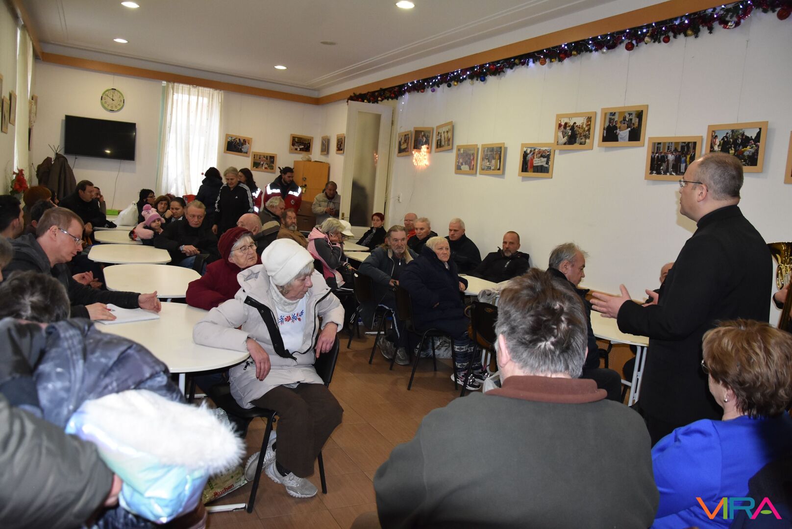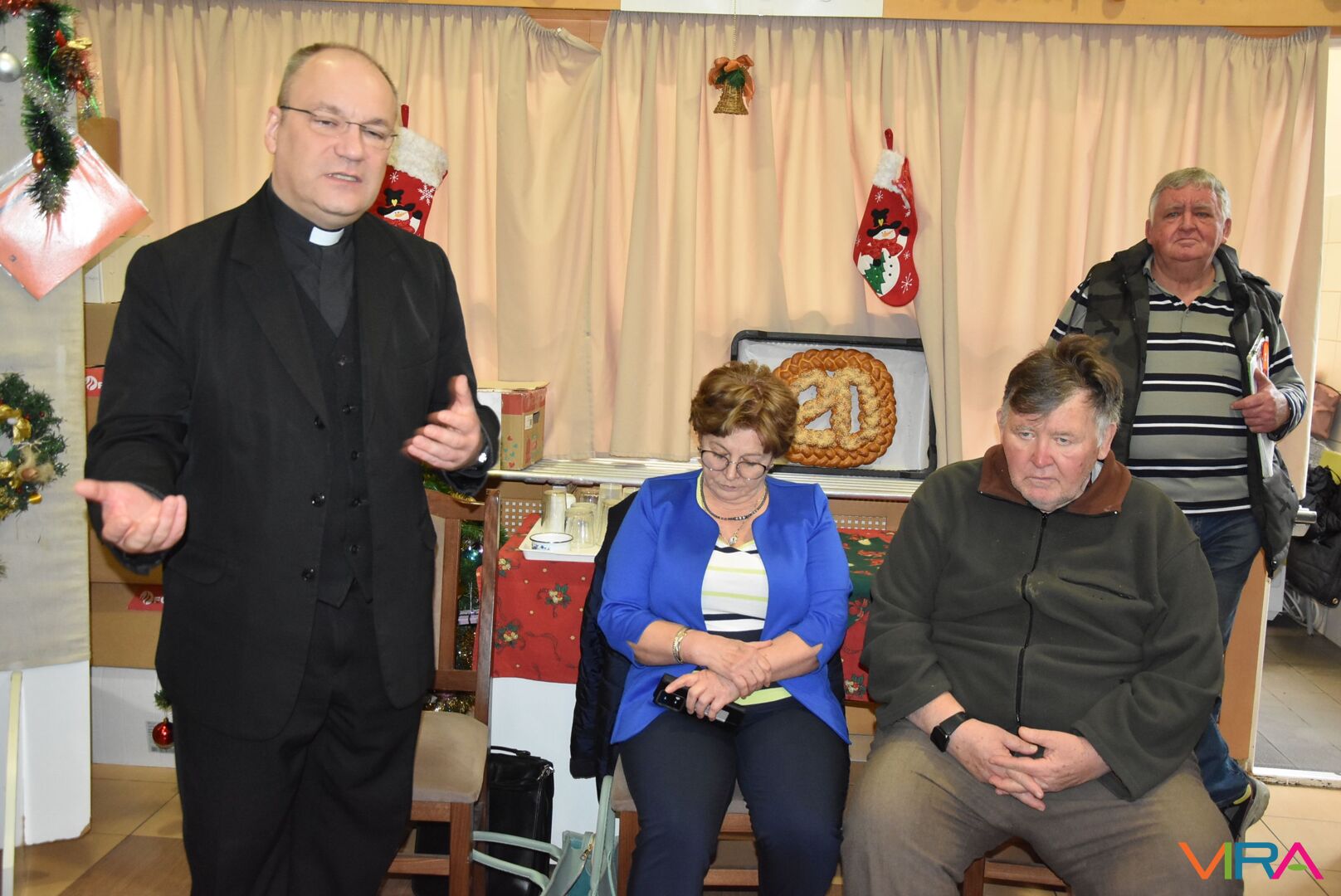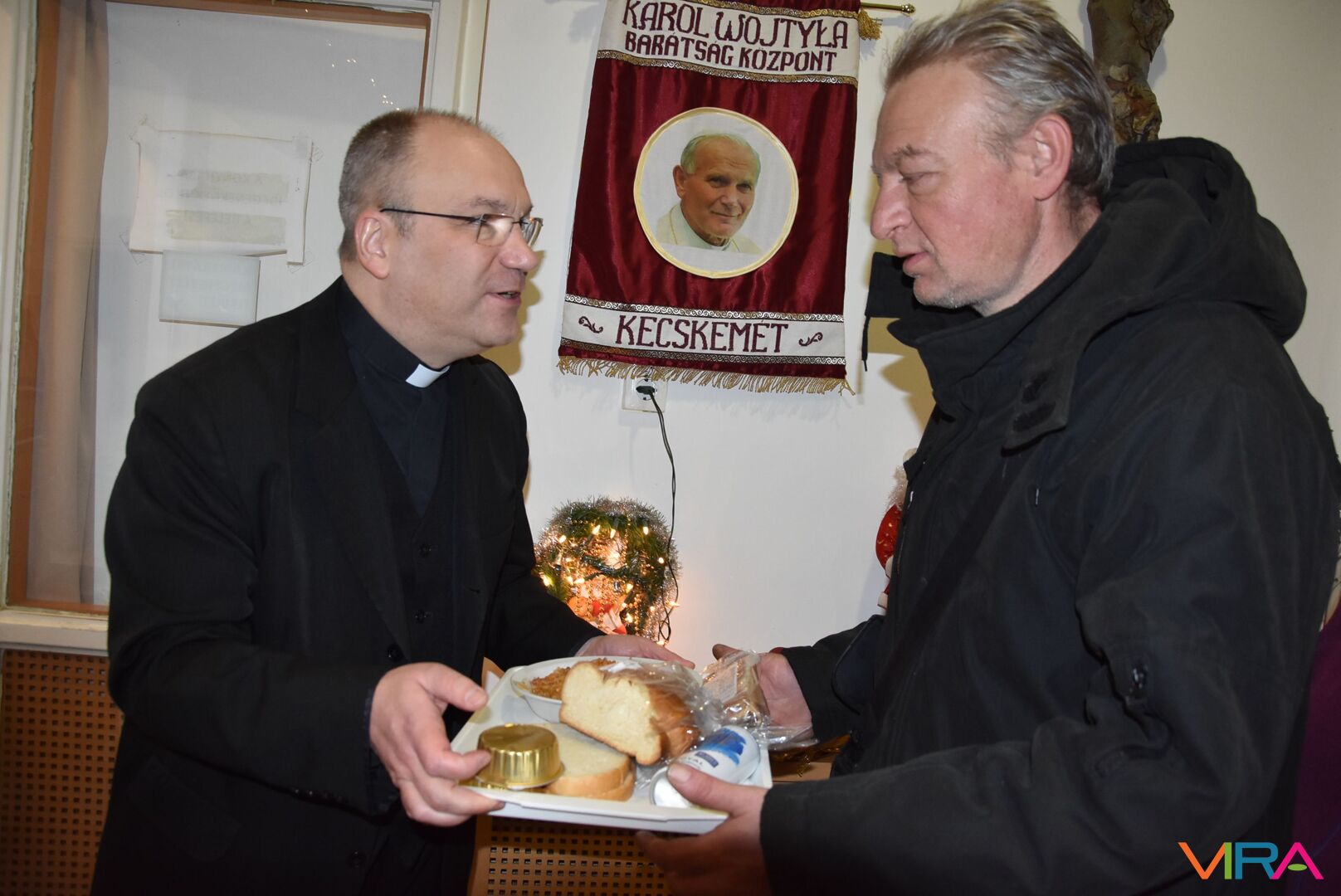 Az ünnepi gondolatok sorát Fekete Szabolcs atya folytatta, aki a széchenyivárosi Szentcsalád Plébánia plébánosaként köszöntötte az ebédre várakozókat. Nem csupán lelkipásztori minőségében volt jelen; mint a szeretetebéd felajánlója, a plébánia hívőközösségének nagylelkűségét is képviselte. Elmélkedésében arra hívta fel a figyelmet, hogy Krisztus születése egy egész élet alatt érhet meg igazán bennünk. A karácsony felszínre hozza az emberben rejlő jót; Jézus pedig, aki a nincstelenség egyszerű körülményei közé született, minden élethelyzetünkben velünk tud maradni, mert születésétől egészen kereszthaláláig osztozott az emberi sorsban.