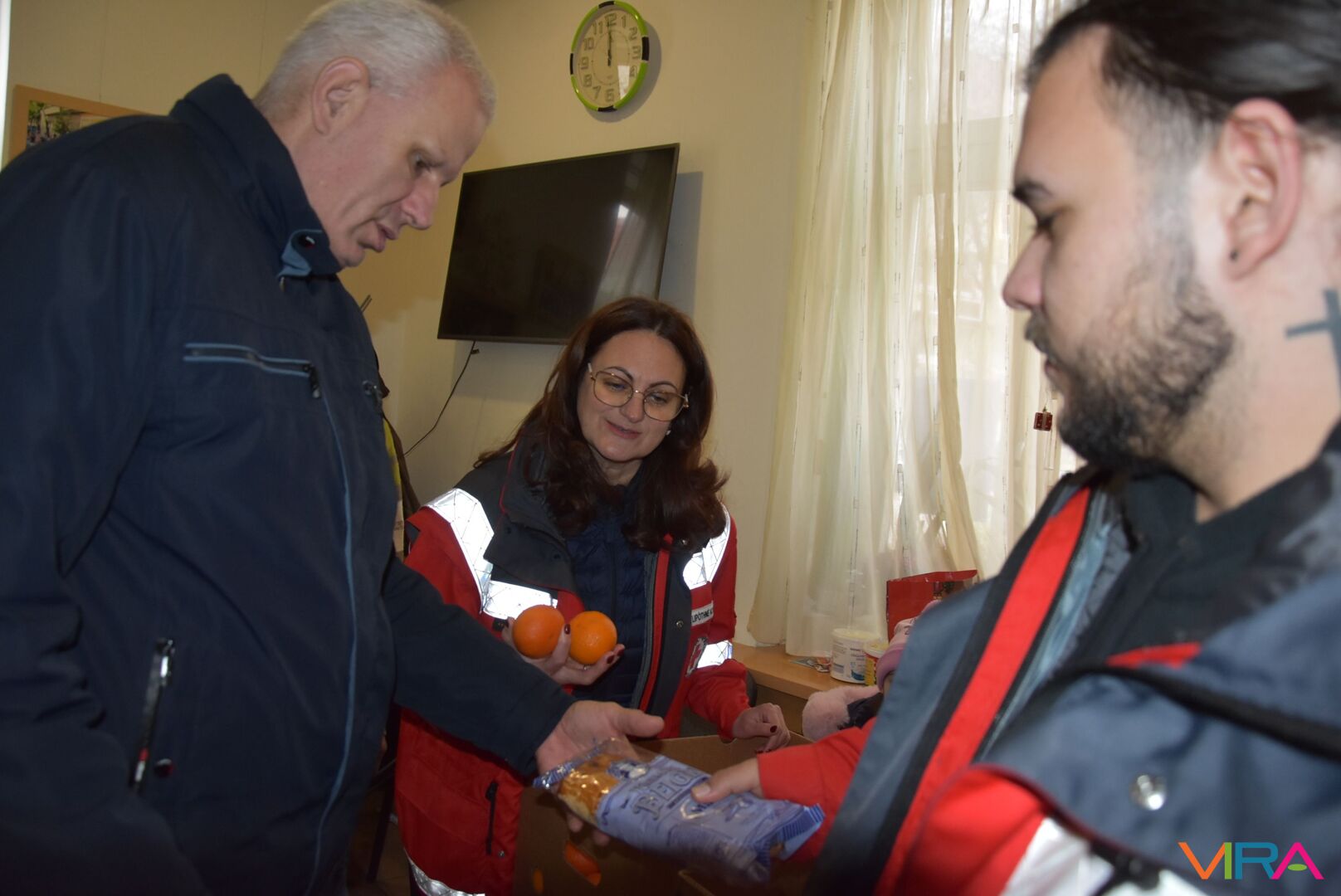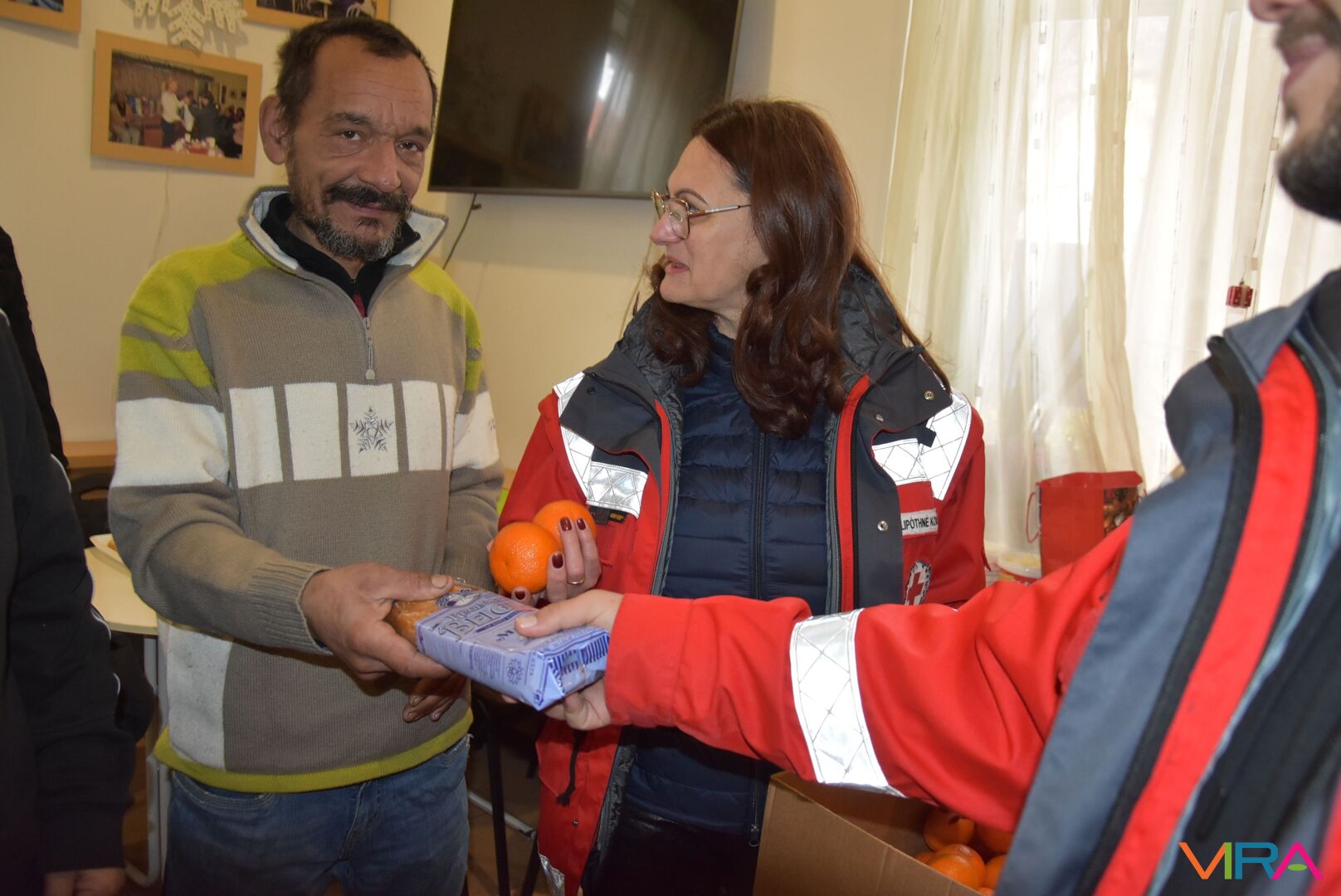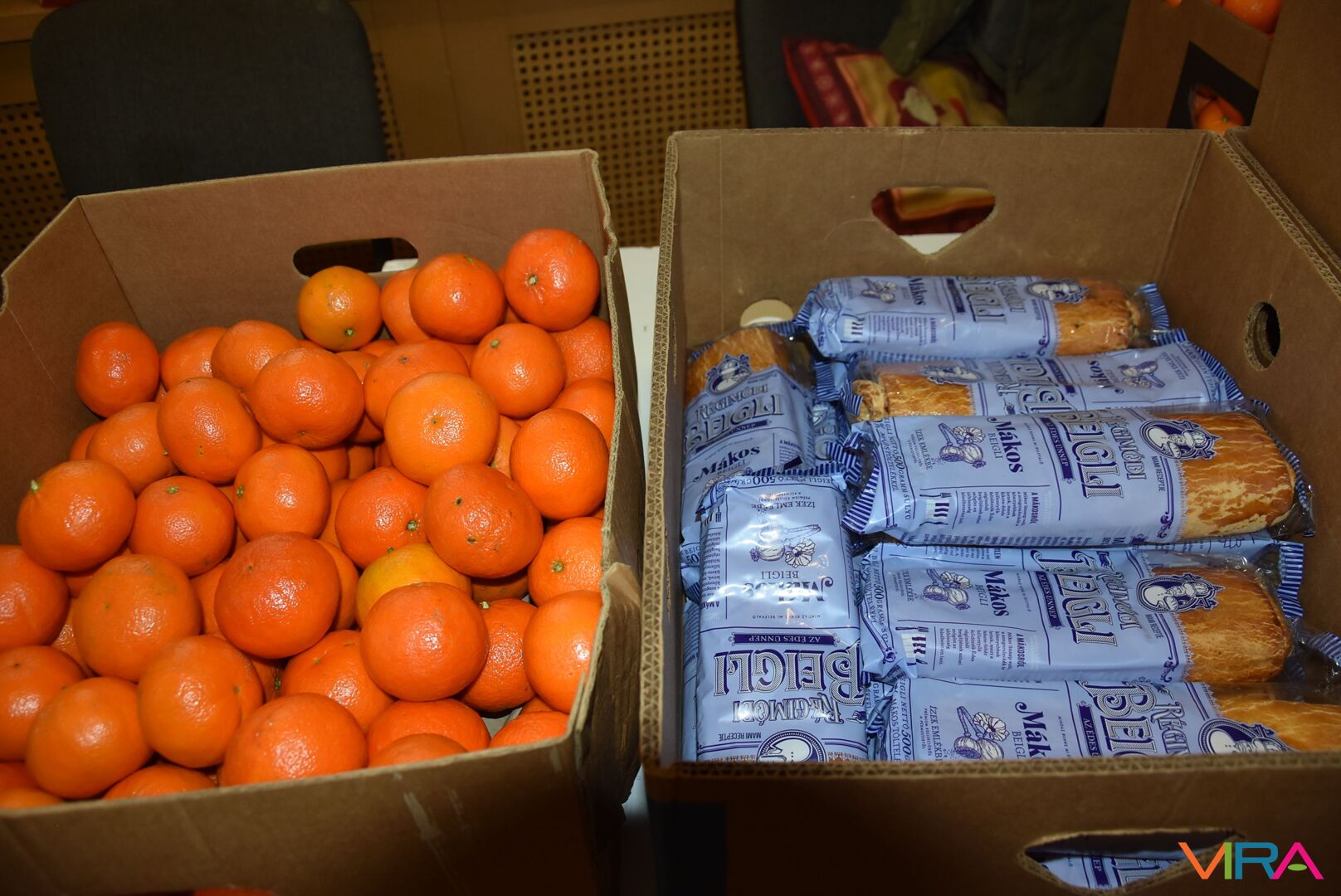 Az ebédosztás idején Lipóthné Komjáti Andrea, a Magyar Vöröskereszt Bács-Kiskun vármegyei igazgatója és munkatársa friss, zamatos narancsot, továbbá mákos és diós bejglit osztott az elesetteknek.