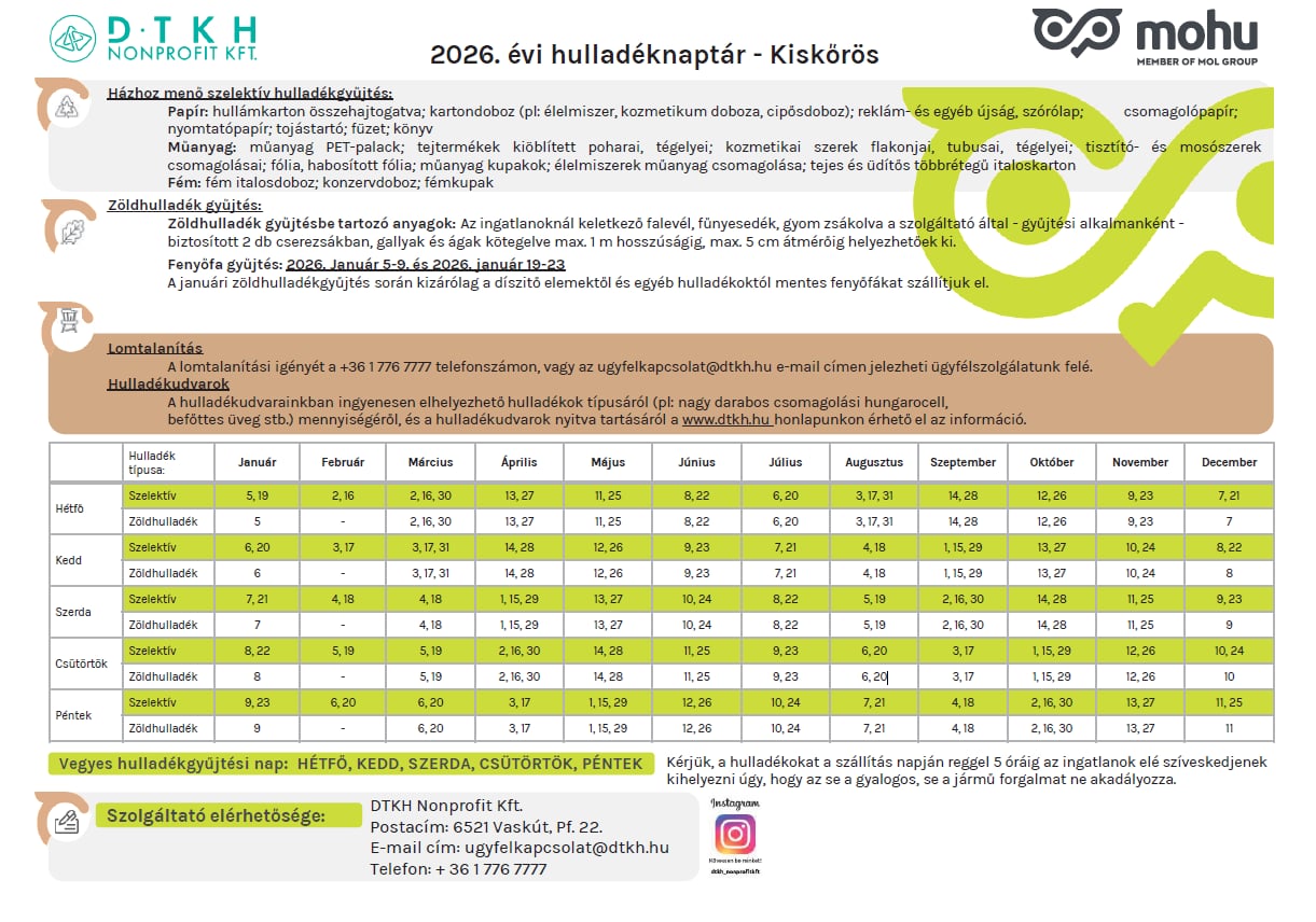 Tájékoztatjuk a tisztelt lakosságot, hogy Kiskőrös városában a 2026. évi hulladékszállítást is a DTKH Nonprofit Kft., a MOHU – MOL Csoport tagja végzi.