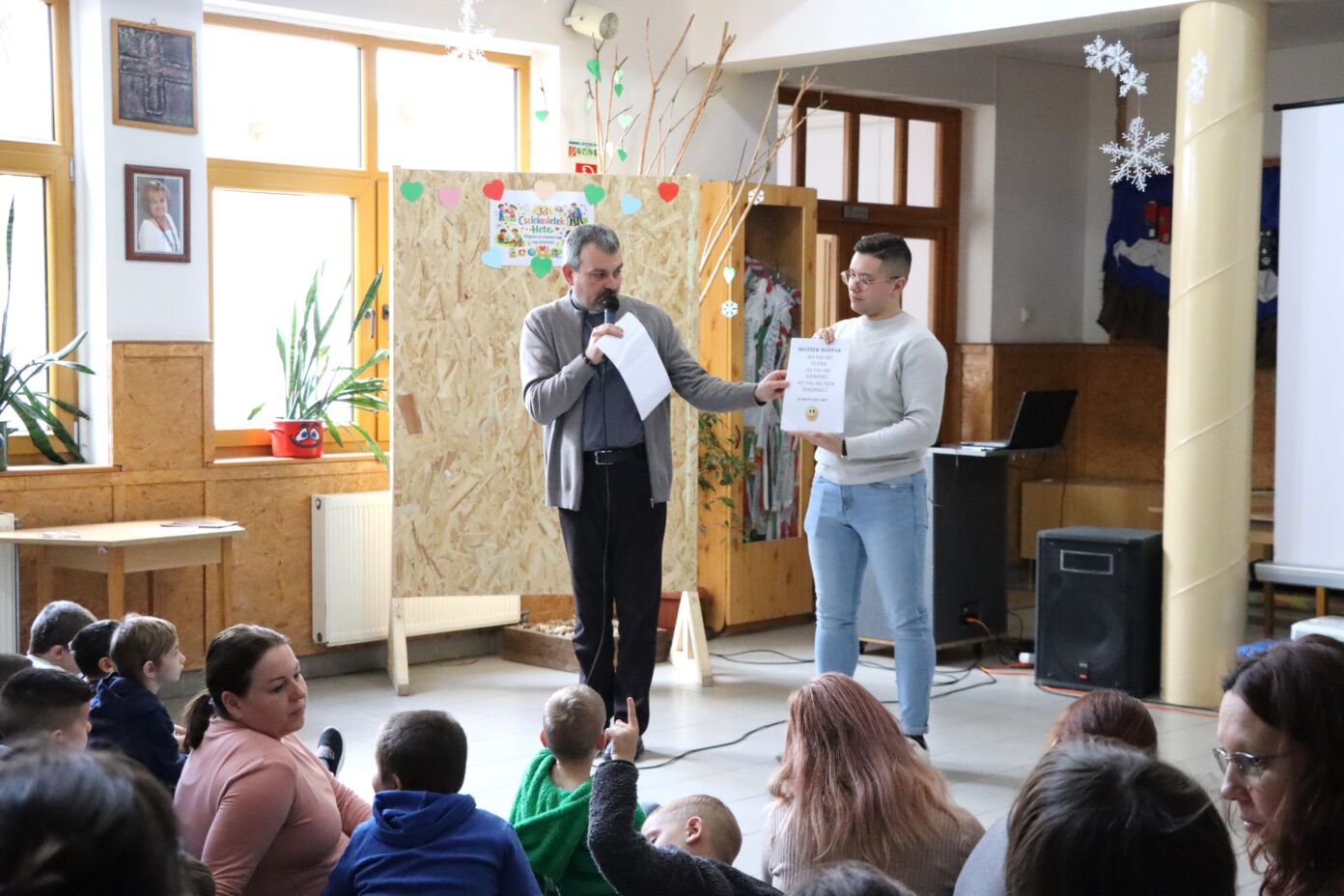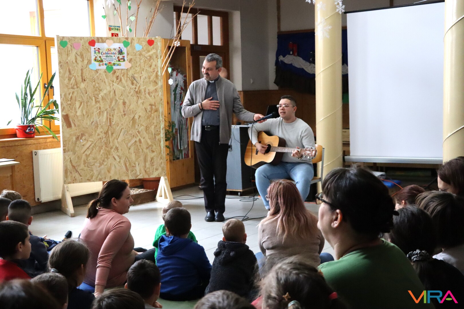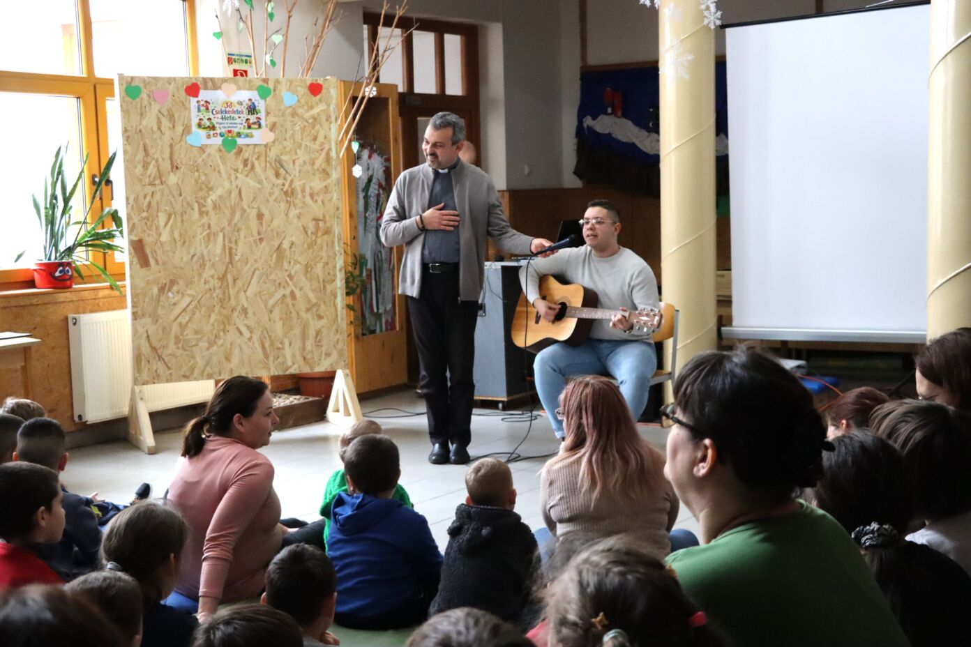 Ezt követően Seffer Attila atya köszöntötte a gyermekeket, majd egy játékos éneklés vette kezdetét Erdődi Imre, a plébánia munkatársának gitárkíséretével. A tanulók örömmel kapcsolódtak be a közös éneklésbe.