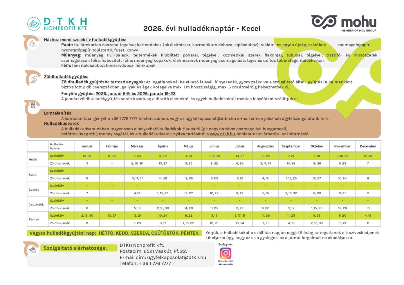 A DTKH Nonprofit Kft. közzétette Kecel város 2026. évi hulladéknaptárát, amely részletes tájékoztatást ad a házhoz menő szelektív és zöldhulladék-gyűjtés időpontjairól, valamint a lomtalanítással kapcsolatos tudnivalókról.