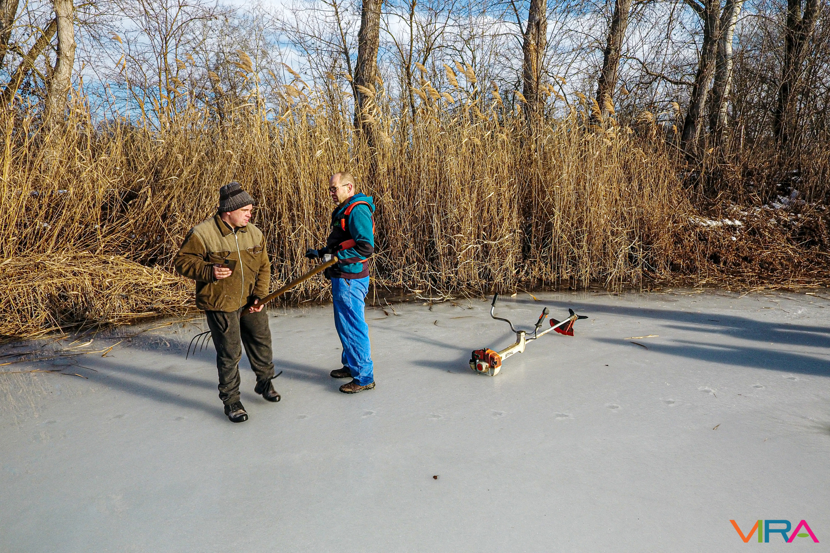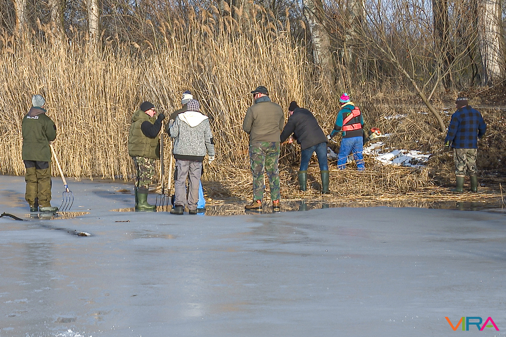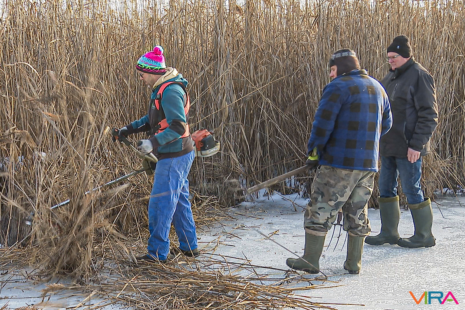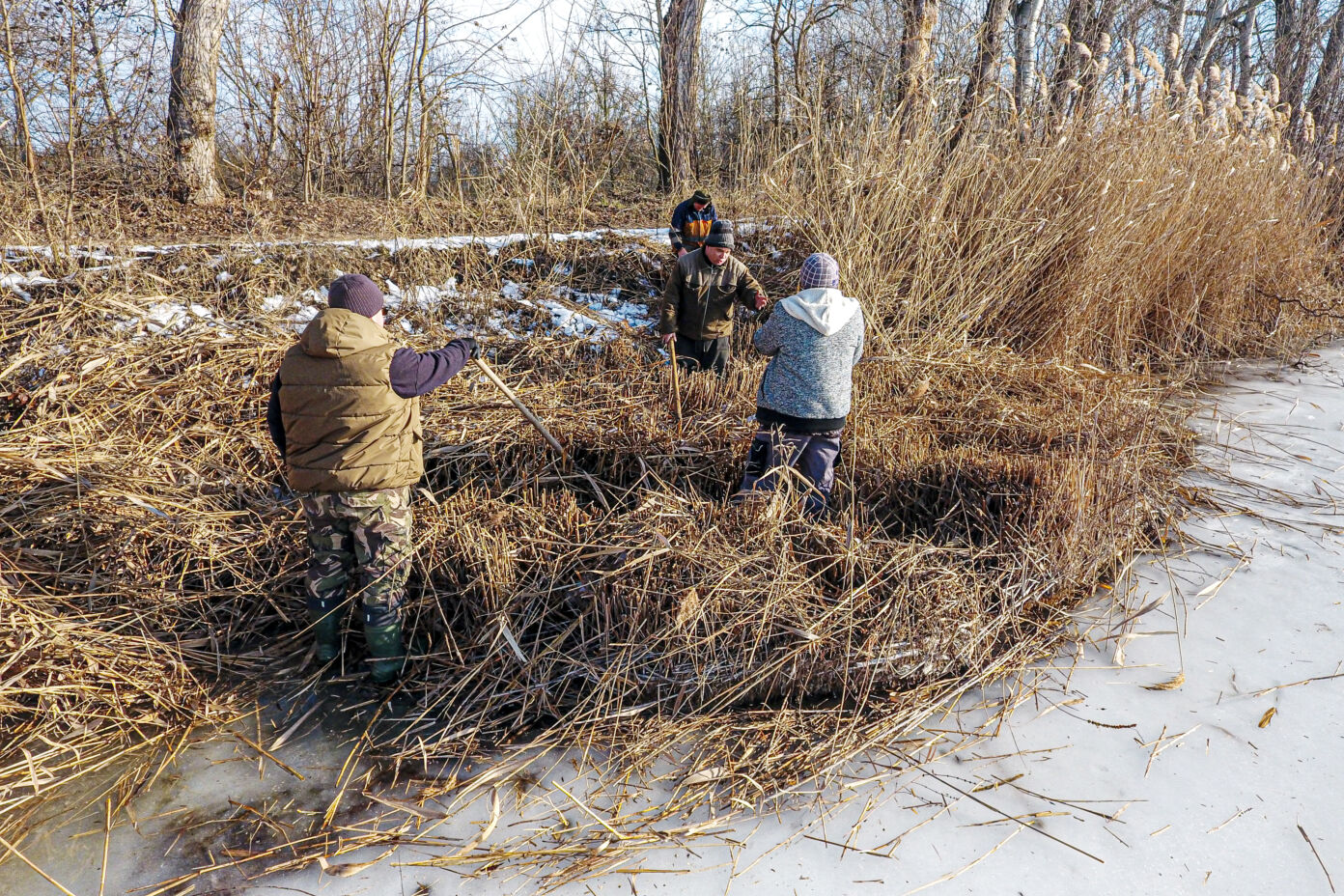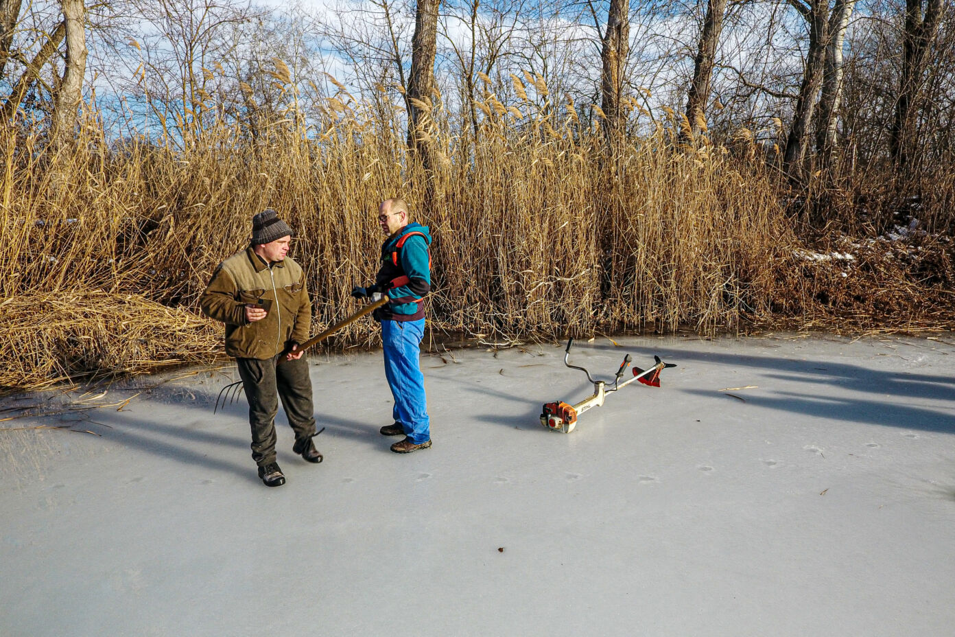 A munkálatokat különböző kézi eszközökkel hajtották végre, azonban a Vadkert Komszolg Kft. nádvágó gépe alatt sajnos beszakadt a jég, így az nem tudott nagymértékben hozzájárulni a nádvágáshoz.