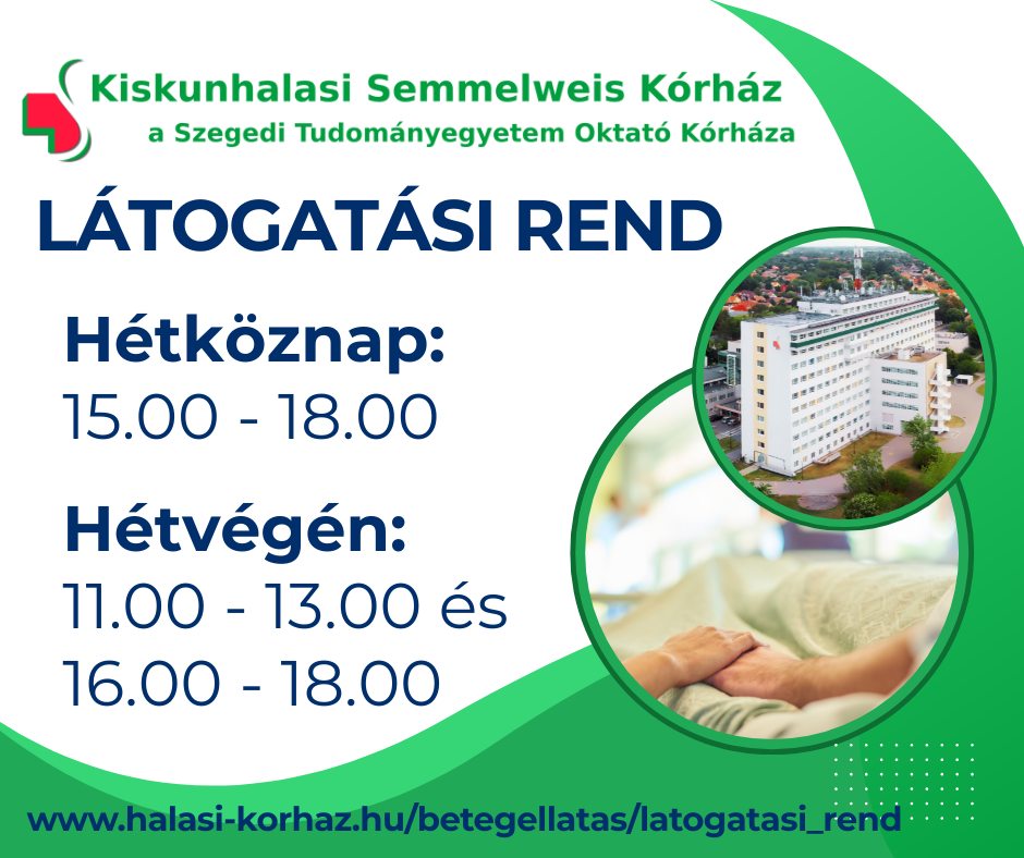 2026. február 2-től módosult a látogatási rend a halasi kórházban. Hétköznapokon 15 és 18 óra között, hétvégén, munkaszüneti és ünnepnapokon pedig 11–13 óra, valamint 16–18 óra között fogadhatók látogatók.
