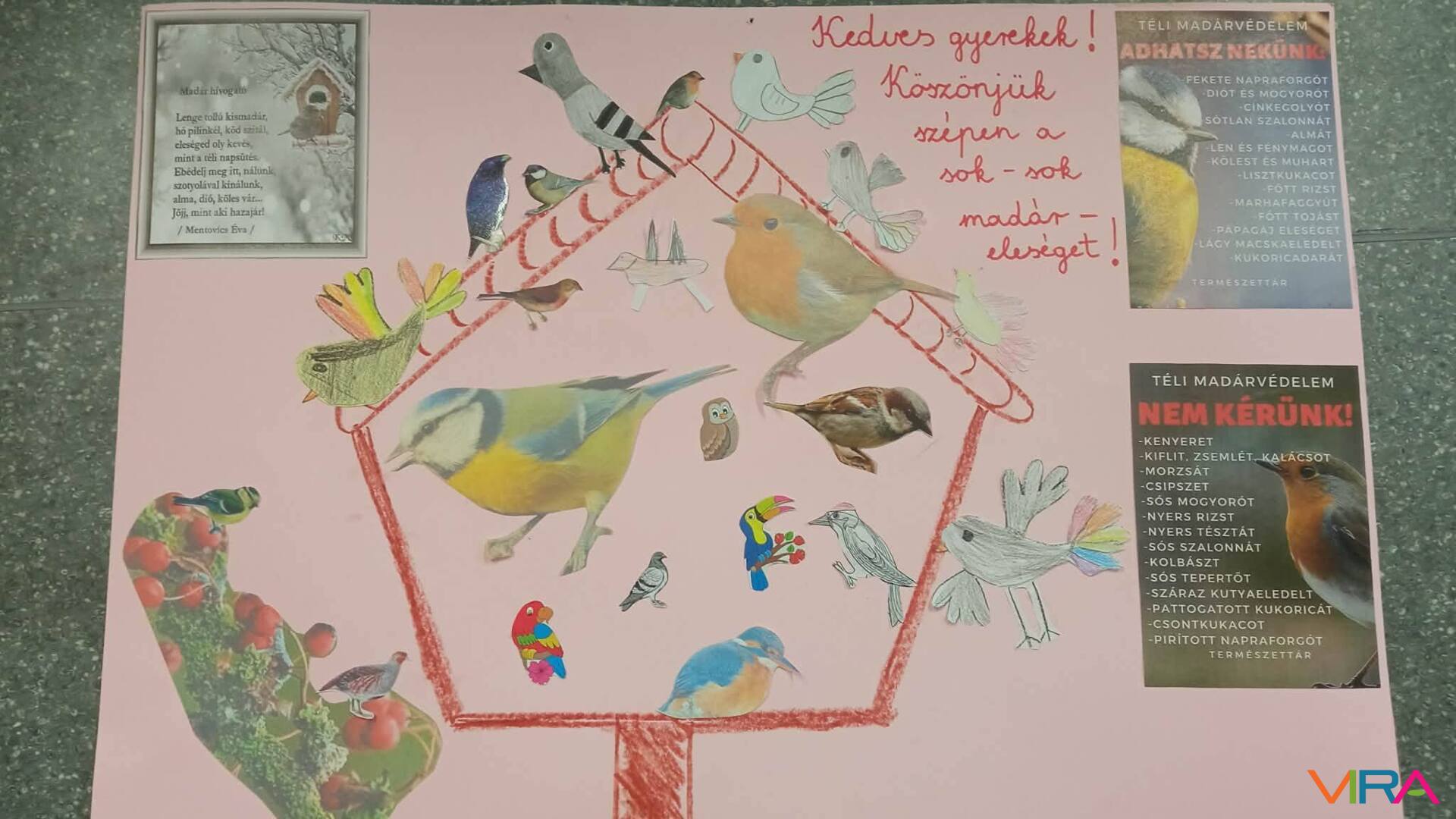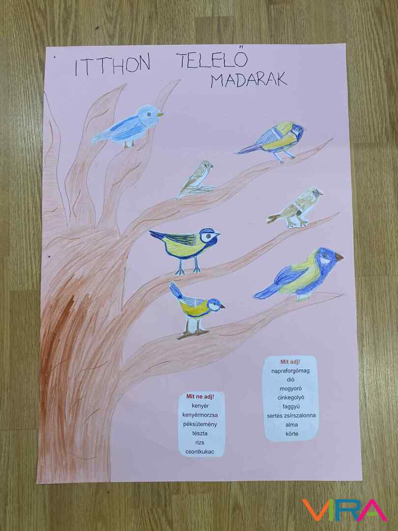A 2. évfolyam tanulói kreatív plakátokat készítettek, amelyek segítségével bemutatták az itthon telelő madárfajokat és azok jellemzőit.