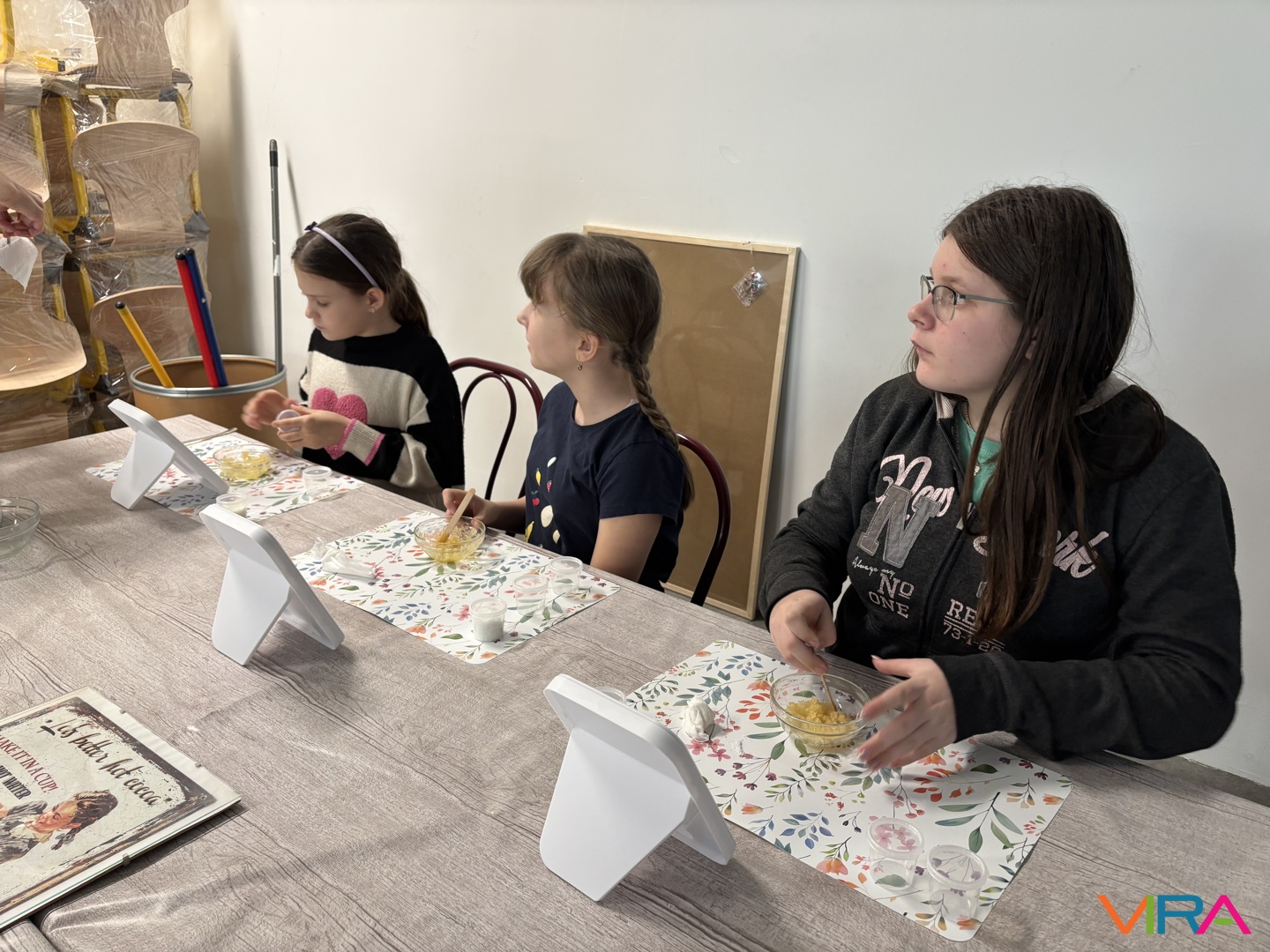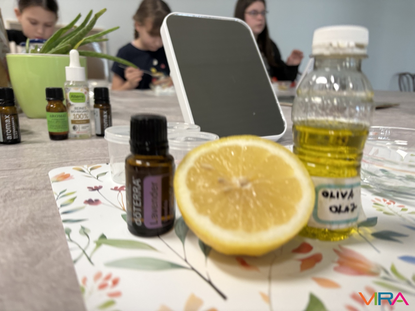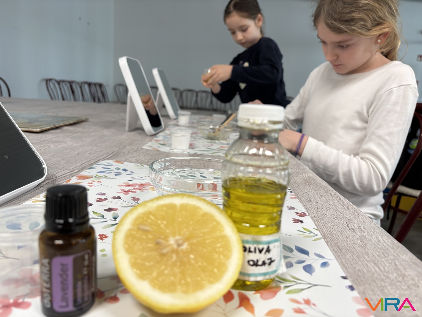 Egy natúr báziskrémbe friss aloe vera növény és egy kevés arctápláló olaj került. A gyerekek láthatták, hogyan lehet természetes módon hidratálni és ápolni a bőrt.