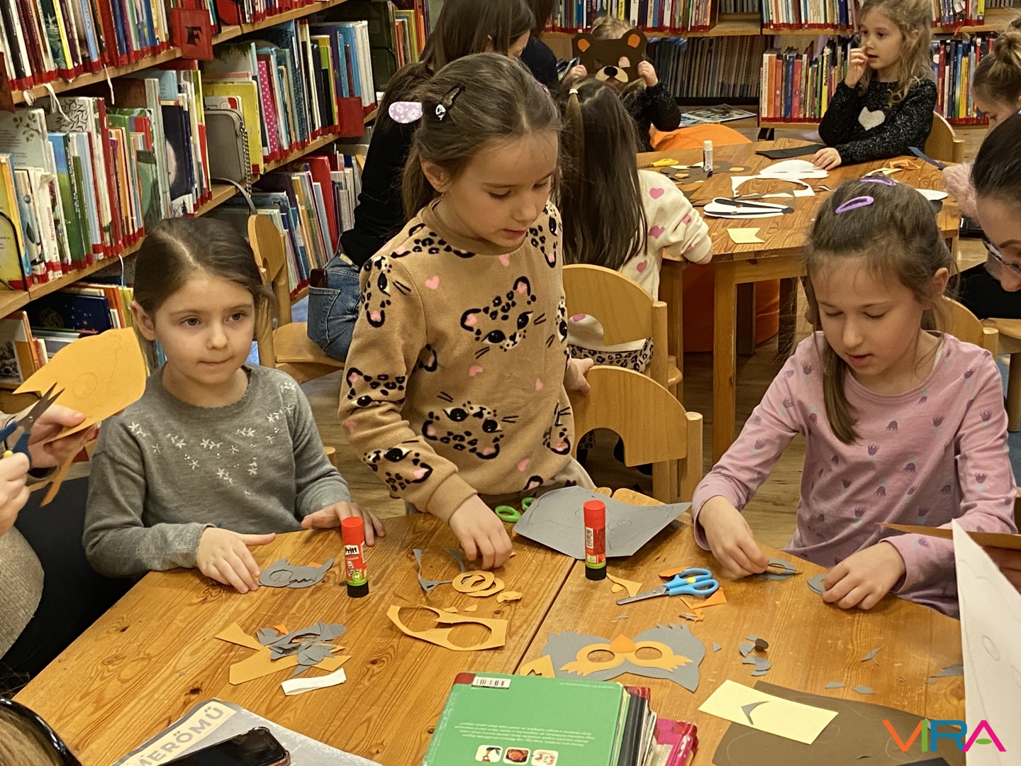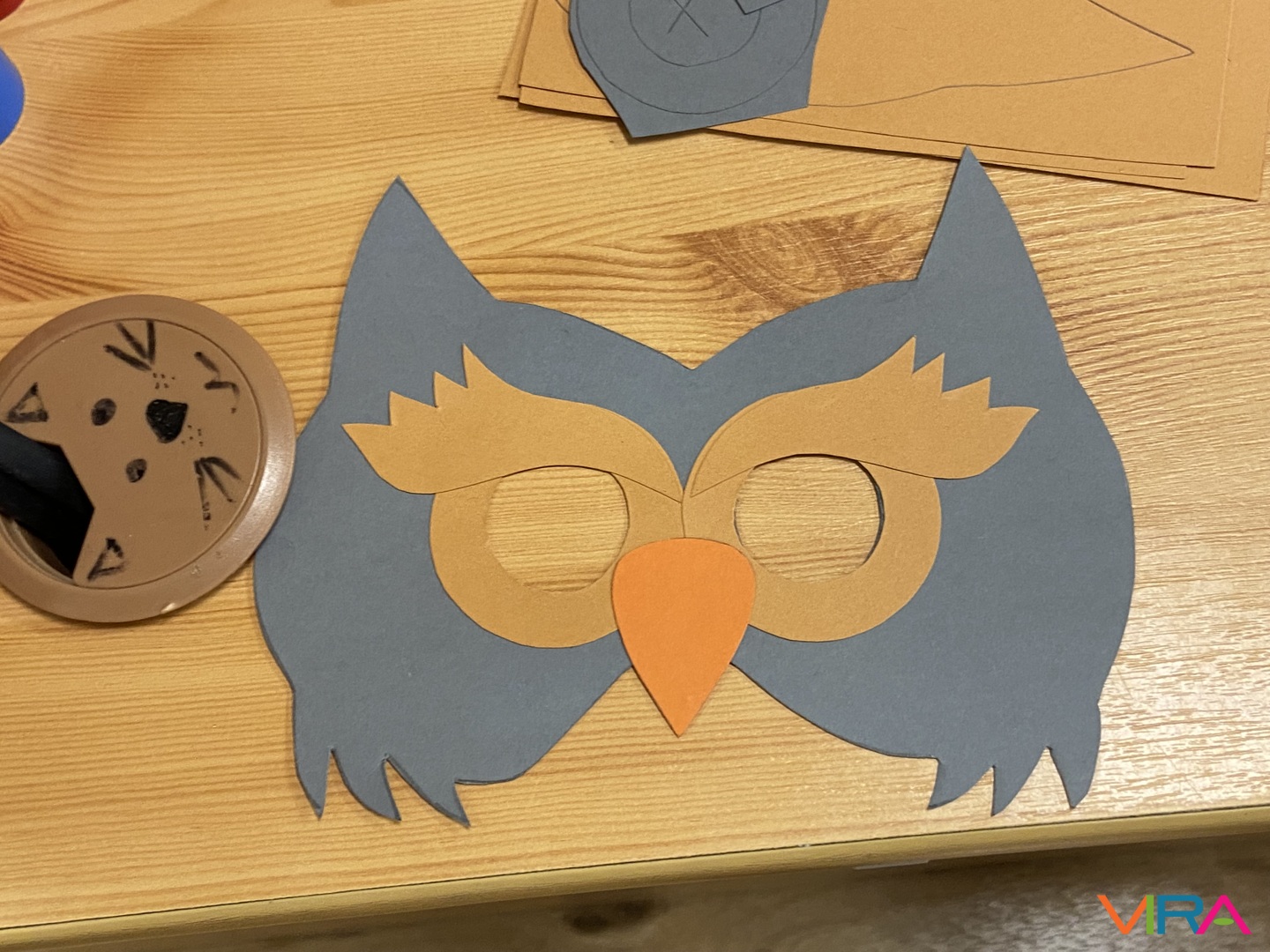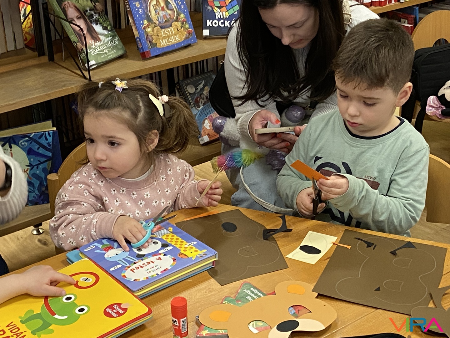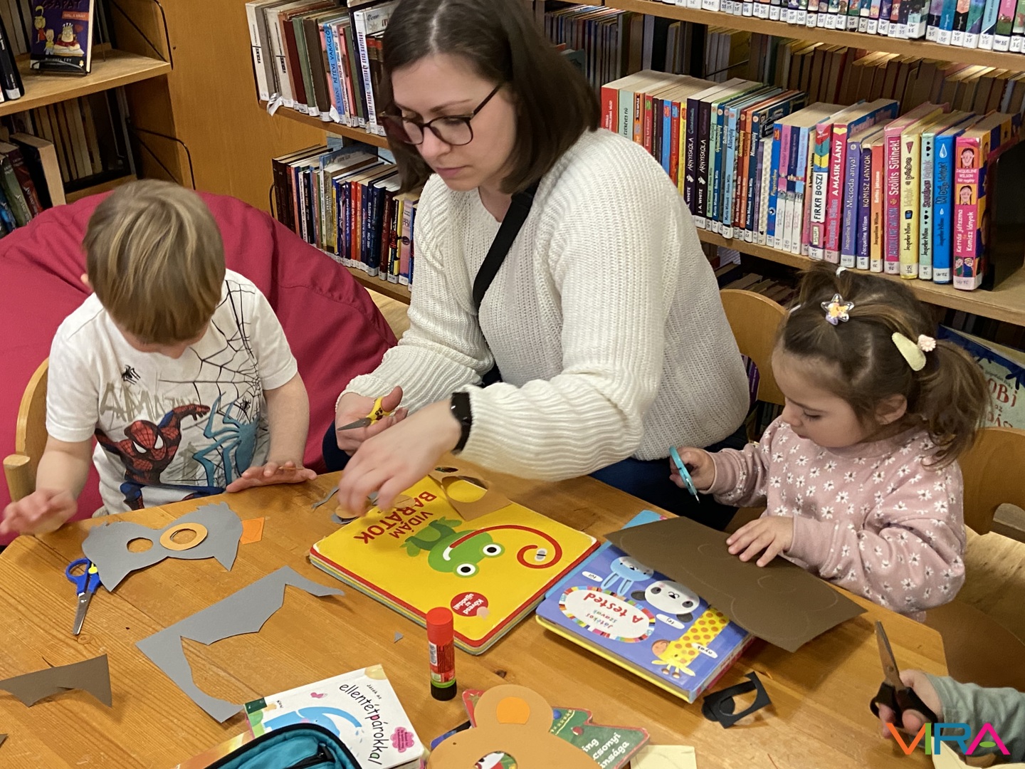 A mesemondást követően a szokásos kézműves foglalkozás következett, amely ezúttal a farsanghoz kapcsolódott. A gyerekek állatos tematikájú álarcokat készítettek, amelyhez háromféle mintából választhattak: mackó, bagoly és borz maszk közül dönthettek. A sablonok segítségével a résztvevők kivágták, összeállították és díszítették saját álarcaikat, miközben a szülők és nagyszülők is bekapcsolódtak a közös alkotásba. A foglalkozás így nemcsak kreatív tevékenységet, hanem családi együttlétet is jelentett.