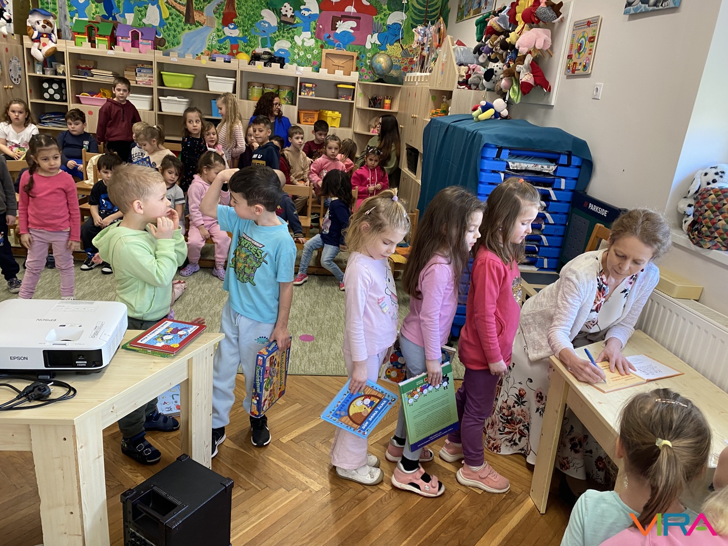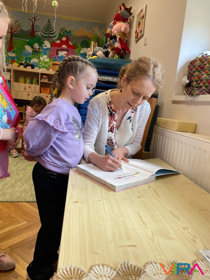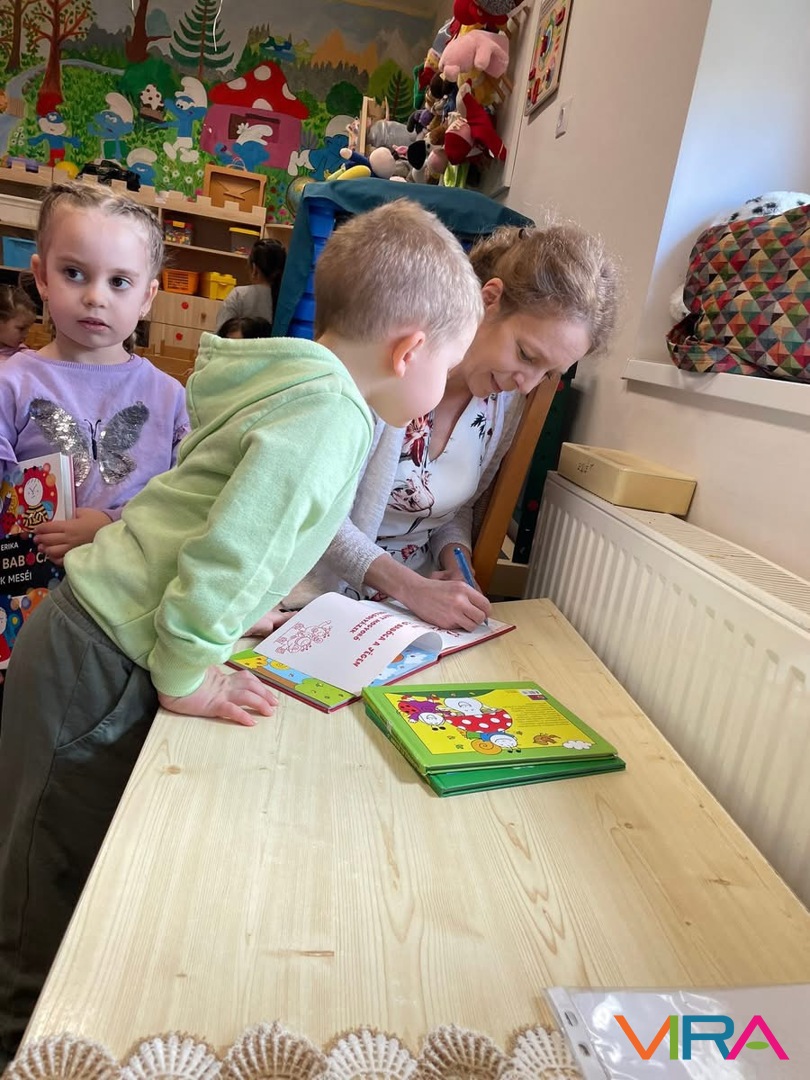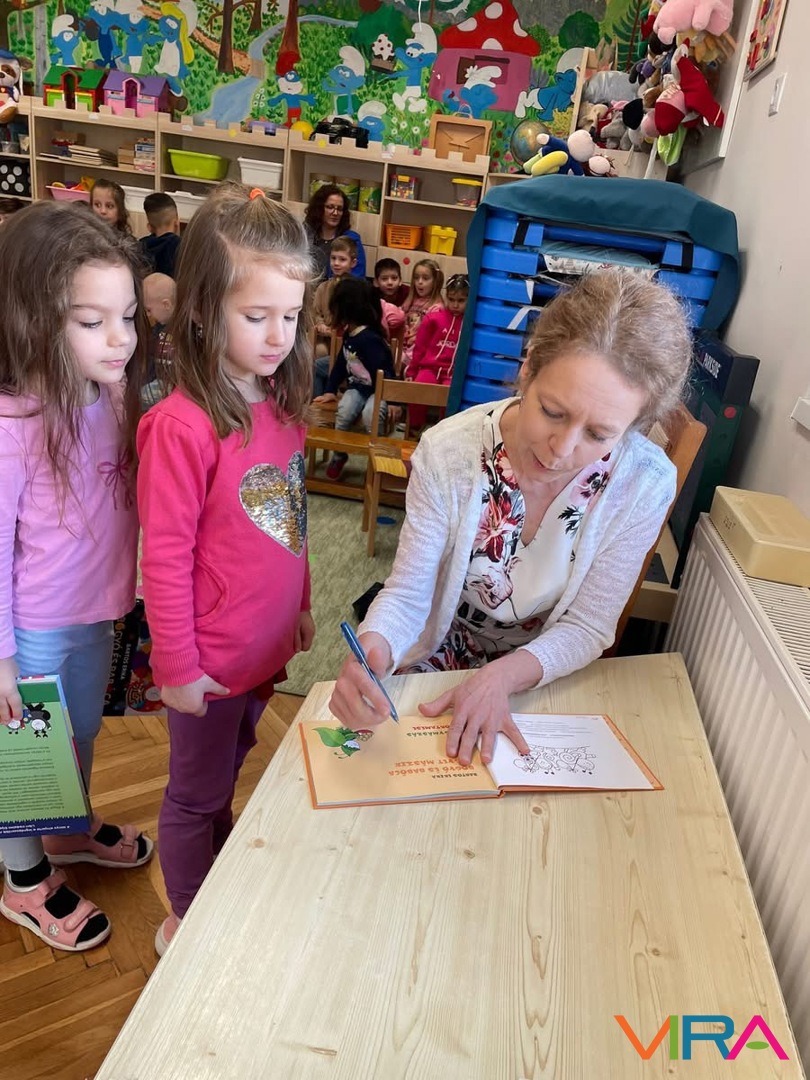 A meseprogram végén lehetőség nyílt dedikálásra is: a gyerekek és a felnőttek az otthonról hozott saját könyveiket adhatták aláírásra, ami hatalmas örömet jelentett számukra. Az írónő meglepetéssel is készült: saját kezűleg rajzolt színezőkkel ajándékozta meg a gyerekeket.