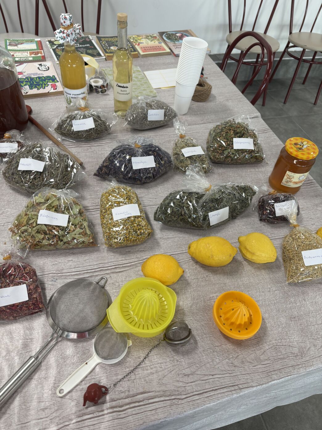 A teremben már az első pillanattól csodálatos illatok fogadták a gyerekeket: szárított teafüvek, virágok és fűszerek töltötték meg a levegőt. A gyógynövényeket mind Annamari gyűjtötte és szárította, így a gyerekek valódi, természetes alapanyagokkal ismerkedhettek meg.