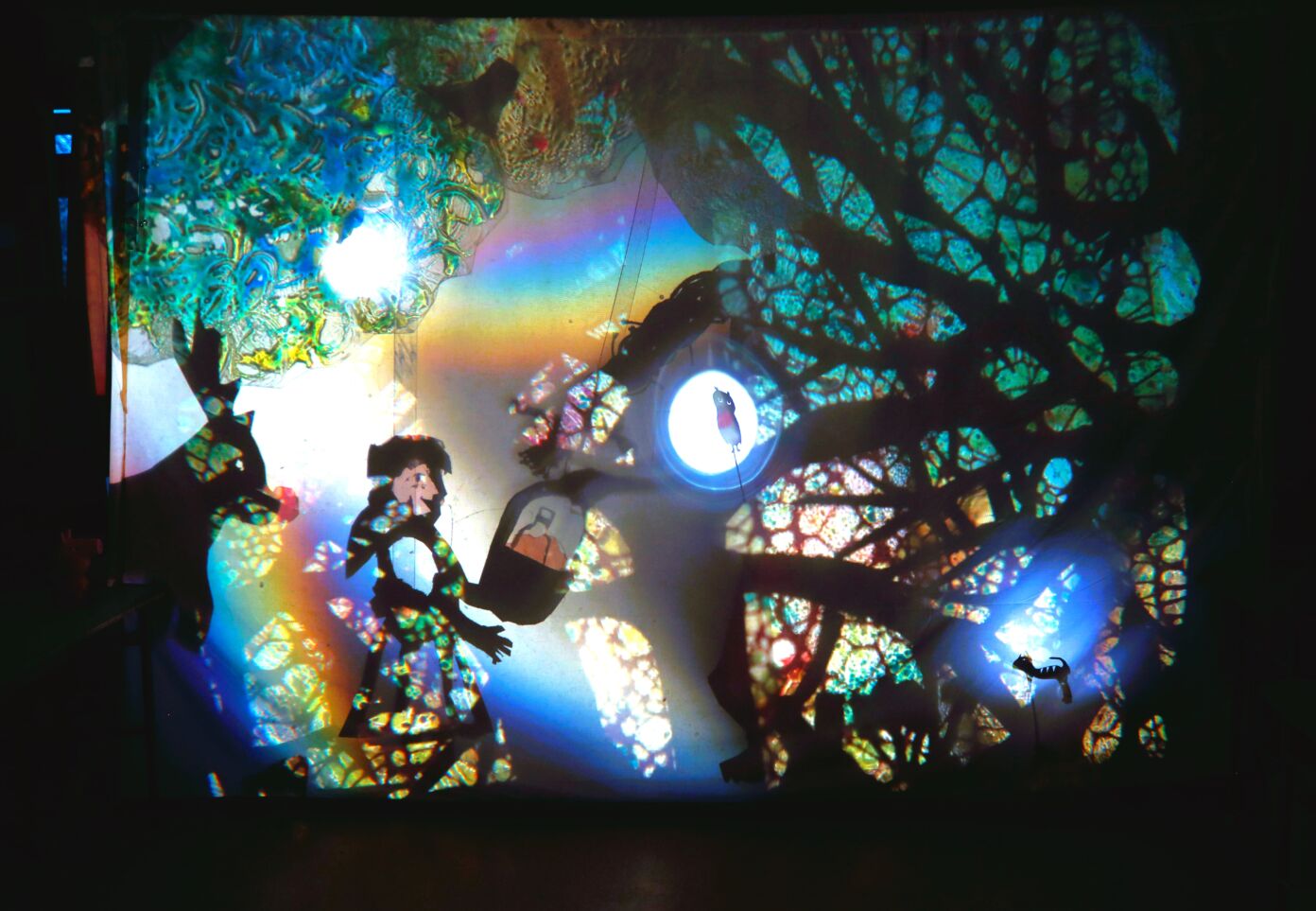 Írásvetítőkkel és különböző lámpákkal alkottuk a képet. A bábok a hagyományos árnybábokon kívül különböző anyagokból készültek, többek között hulladékokat vetítettünk, abból álltak össze a festői képek. Tulajdonképpen festettünk, festék nélkül mozgóképet hulladékokkal és fényekkel. Az erdő effekteket pedig száraz falevelek és gallyak tördelésével hozta létre az erdei kismanónk a színpadon.