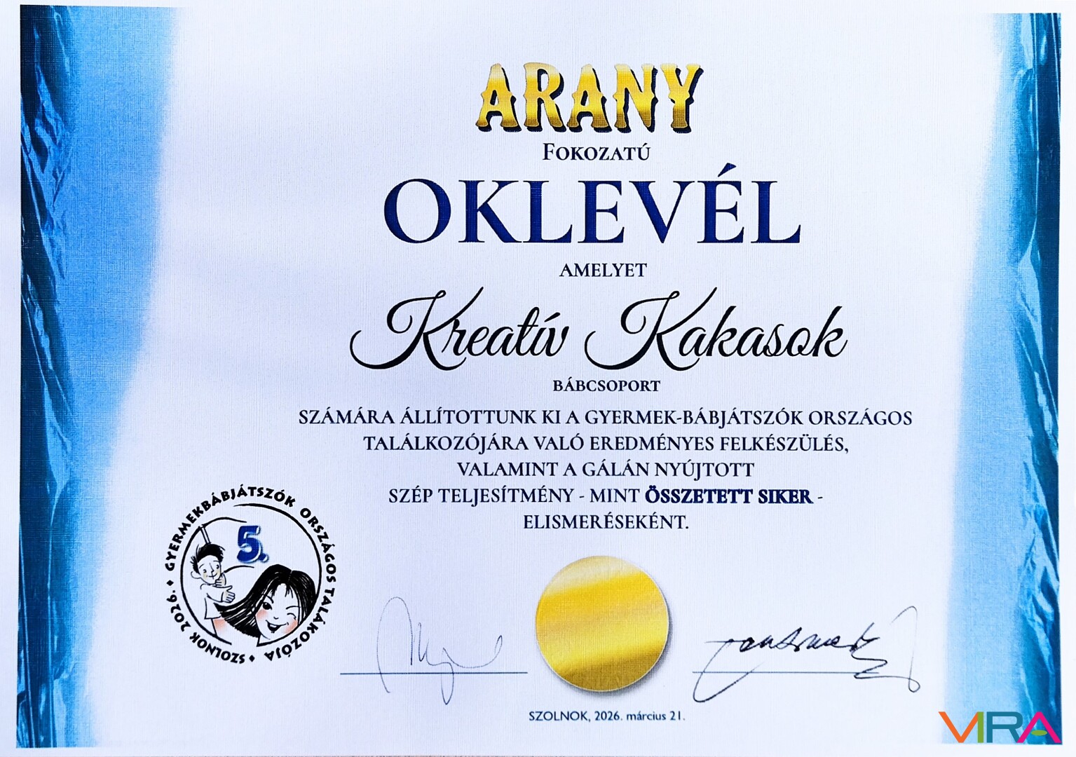 Kukorícza Válogatás című előadásunk 2. Bábos Gálán mutattuk be, arany fokozatú oklevelet kaptunk