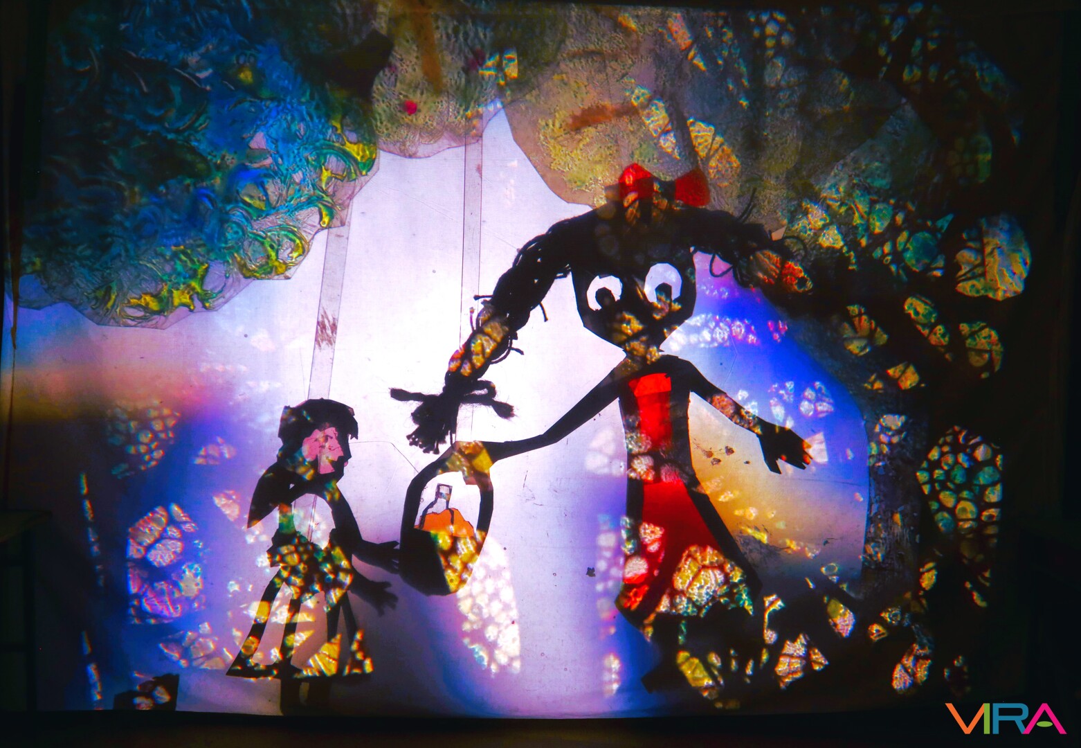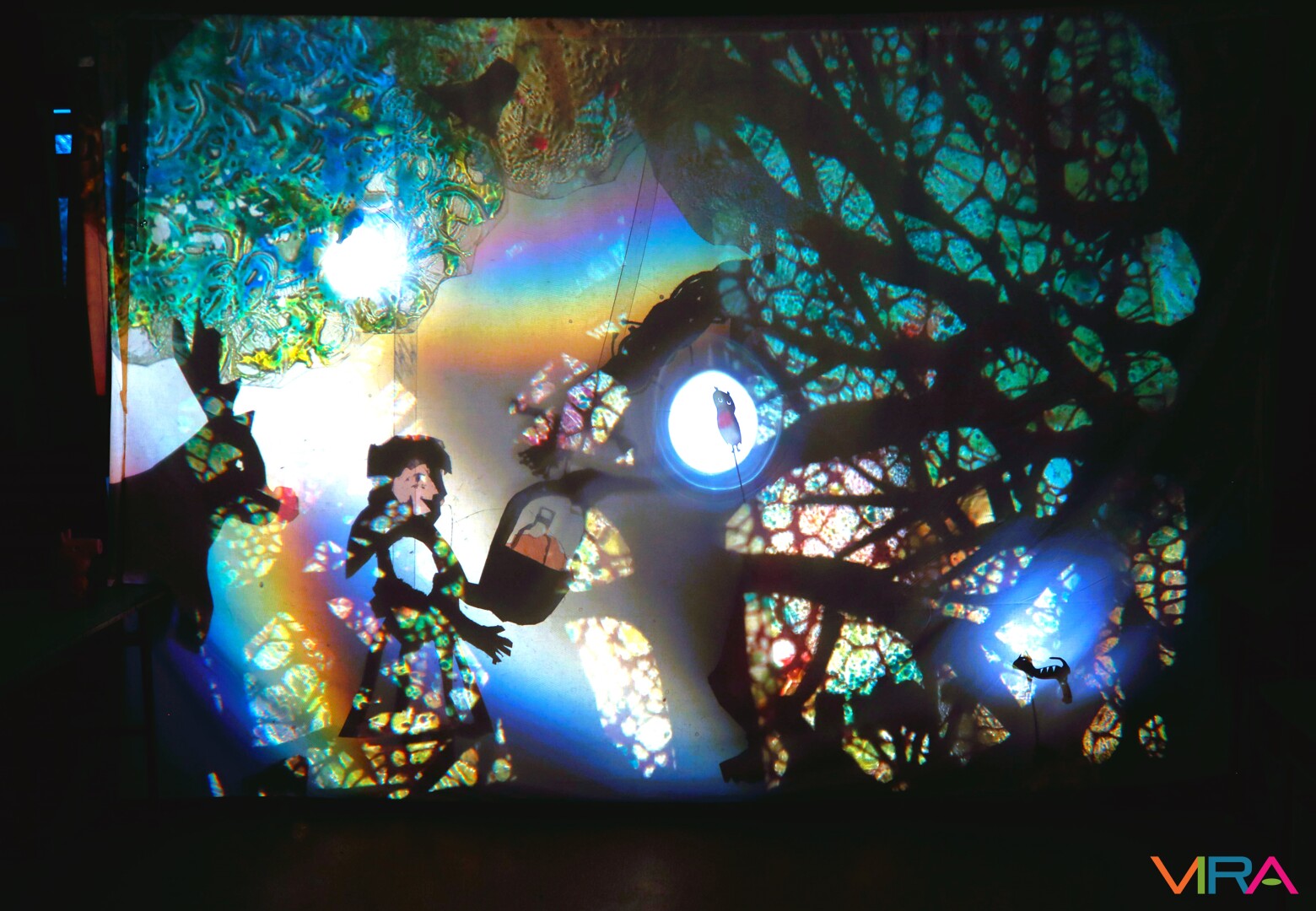Írásvetítőkkel és különböző lámpákkal alkottuk a képet. A bábok a hagyományos árnybábokon kívül különböző anyagokból készültek, többek között hulladékokat vetítettünk, abból álltak össze a festői képek. Tulajdonképpen festettünk, festék nélkül mozgóképet hulladékokkal és fényekkel. Az erdő effekteket pedig száraz falevelek és gallyak tördelésével hozta létre az erdei kismanónk a színpadon.