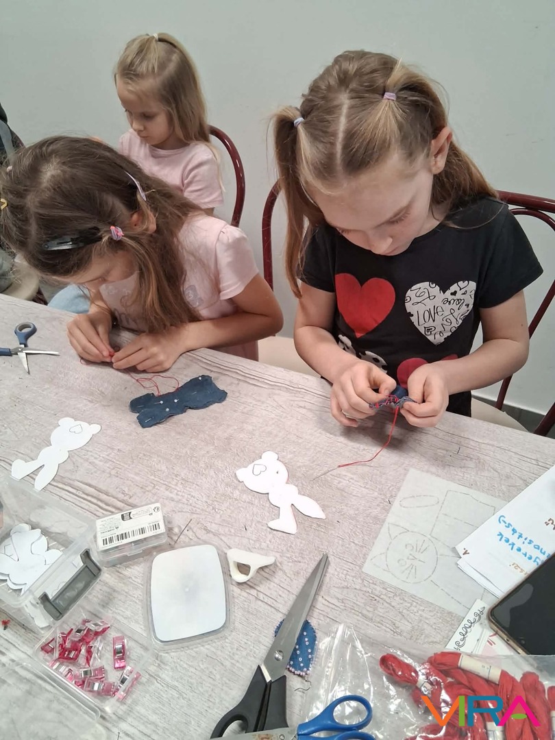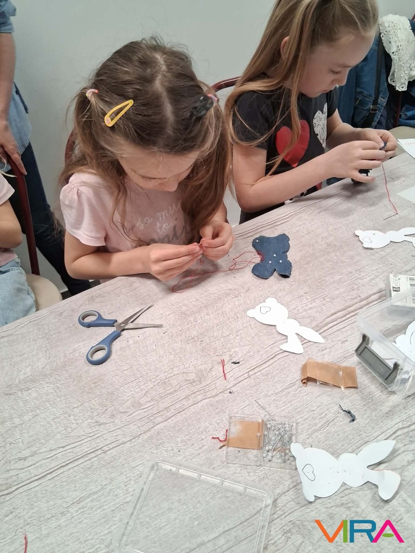 A foglalkozás a varrás alapjaival indult. A gyerekek megismerkedtek a legfontosabb eszközökkel, kipróbálták a tűbefűzést – ami elsőre sokaknak kihívást jelentett –, megtanulták a cérna csomózását, és belekóstoltak a szabásminták használatába is. A pelenkaöltés elsajátítása már igazi „mesteri” feladat volt, de a lelkesedés minden nehézségen átlendítette őket.