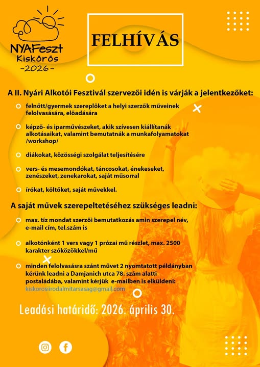 Ismét várják a jelentkezőket a kiskőrösi Nyári Alkotói Fesztivál szervezői, akik 2026-ban is lehetőséget biztosítanak a helyi és környékbeli tehetségek bemutatkozására. A rendezvény célja, hogy teret adjon az irodalom, a zene, a képző- és iparművészet, valamint az előadóművészet iránt érdeklődőknek.