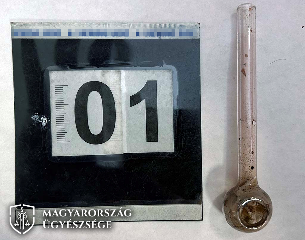 A rendőrség által a helyszíni szemle során készített képeken a vádlottól lefoglalt kés és üvegpipa, illetve a lopással érintett autó betört ablaka látható.