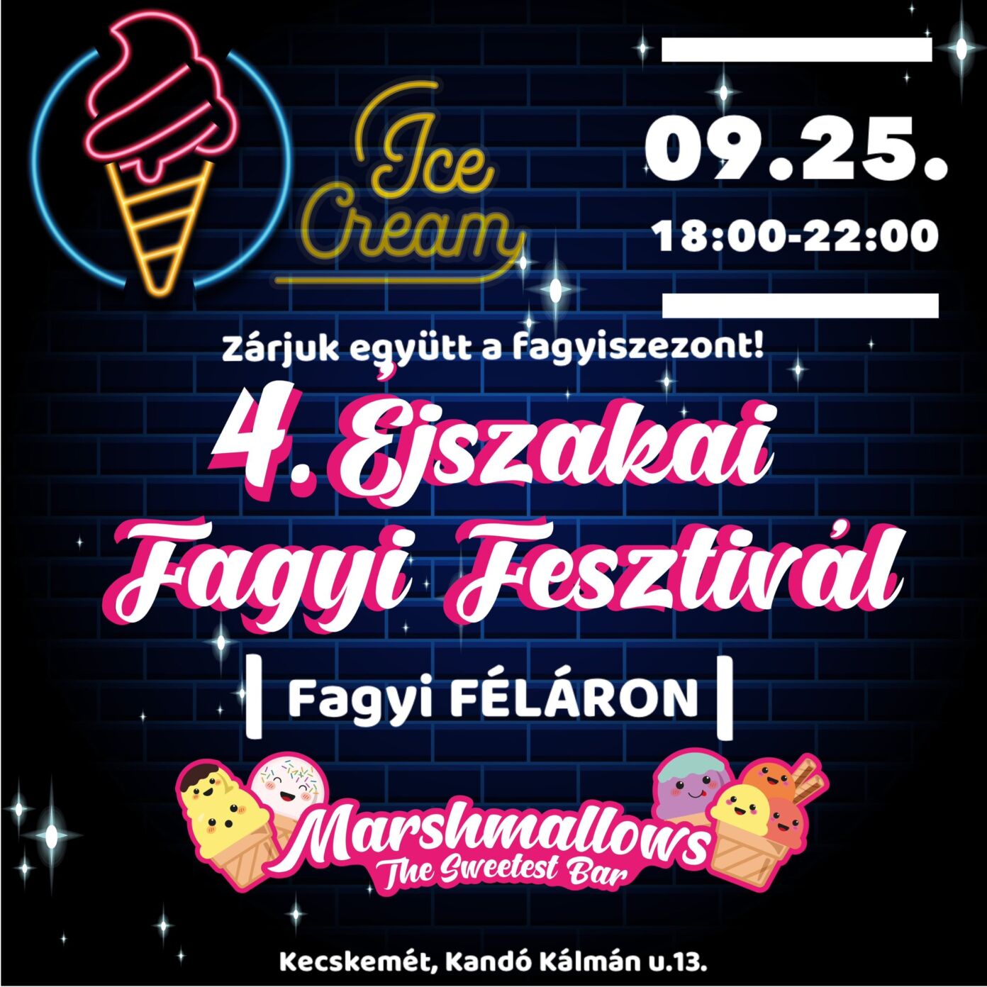 4. Éjszakai Fagyi Fesztivál 2025-09-11 Kecskemét, Kandó Kálmán u. 13. , 2025. szeptember 25. 18:00 - 22:00 Facebook esemény