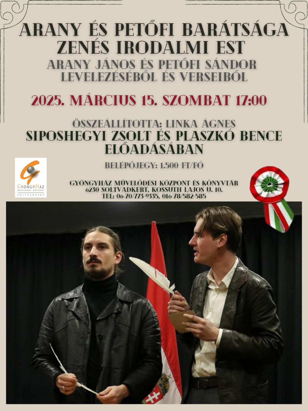 Kedves Vendègeink! A màrcius 15. szombat 17 òràra tervezett Arany Jànos ès Petőfi Sàndor baràtsàgàròl szòlò zenès irodalmi műsor màrcius 14-èn, pènteken a vàrosi megemlèkezès keretèben tekinthető meg a Gyöngyhàz Művelődèsi Kōzpont szìnhàztermèben.