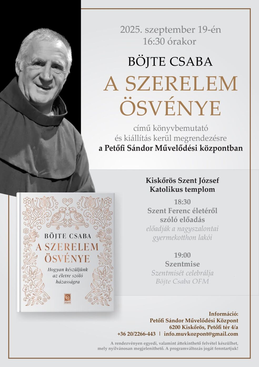 Szeretettel várunk mindenkit 2025. szeptember 19-én, pénteken 16:30-kor a Petőfi Sándor Művelődési Központba, ahol Böjte Csaba ferences rendi szerzetes bemutatja legújabb könyvét: