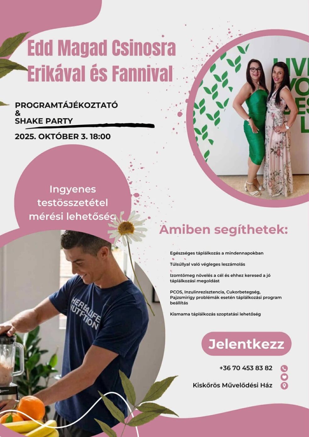 2025. október 3-án pénteken 18:00 órakor, életmódváltó előadást hallhatnak az érdeklődők, “Edd Magad Csinosra Erikával és Fannival” címmel!