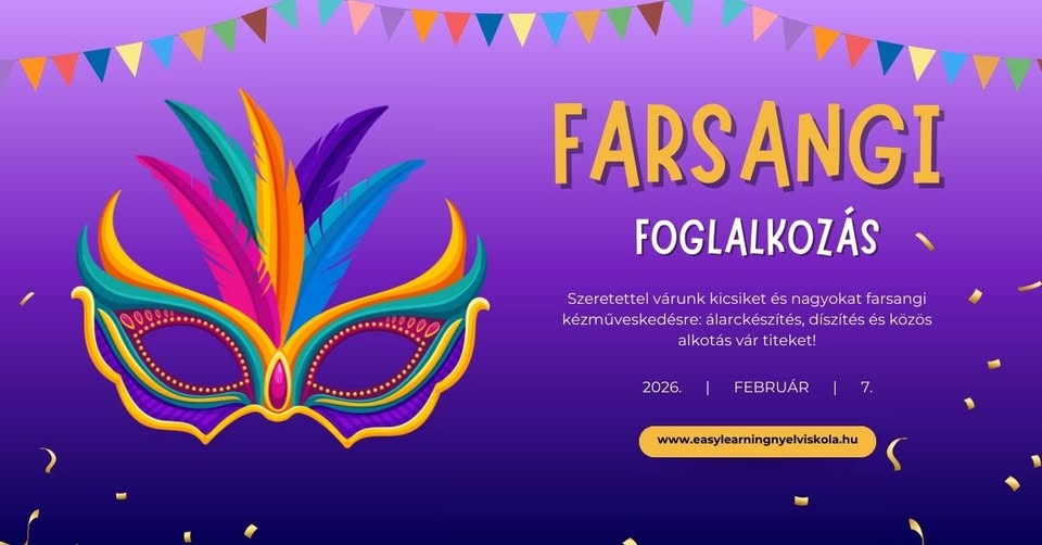 Farsangi foglalkozás 2026-01-20 Kiskőrös, Easy Learning Nyelviskola, 2026. február 7. 09:00 - 12:00 Facebook esemény