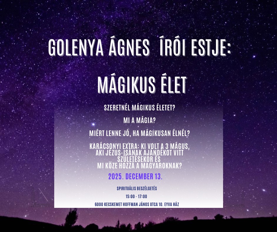 Golenya Ágnes írói estje: Mágikus élet 2025-11-13 Kecskemét, Eyva Ház, Hoffman János utca 10., 2025. december 13. 15:00 - 17:00 Facebook esemény