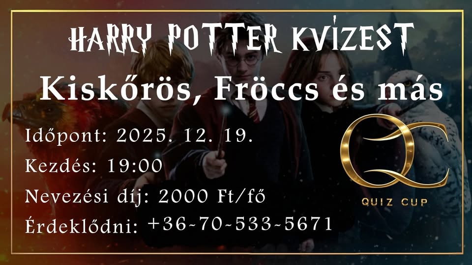 Harry Potter Kvízest A Fröccsben 2025-12-02 Kiskőrös, Fröccs és más, Dózsa György út 38. , 2025. december 19. 19:00 - 21:00 Facebook esemény