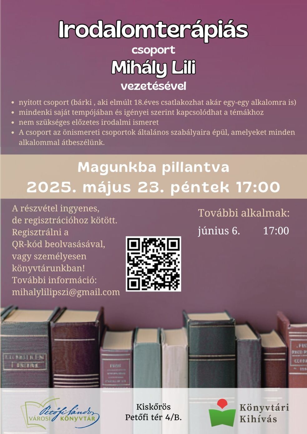 Május 23-én, 17 órakor kerül sor irodalomterápiás csoportunk ötödik foglalkozására Mihály Lili vezetésével. A csoporthoz bárki csatlakozhat, akár egy-egy alkalomra is. A részvételhez regisztráció szükséges, de az eddigi tapasztalatok alapján csak az első 10 jelentkező regisztrációját tudjuk fogadni. Kérjük, mindenképp töltse ki űrlapunkat, vagy kérjék a könyvtár munkatársai segítségét a jelentkezéshez, mert csak a jelentkezettek számára tudunk helyet biztosítani. Aki időközben le szeretné mondani a regisztrációját, kérjük, az elérhetőségeinken jelezze felénk, hogy a csoport teljes létszámban indulhasson.