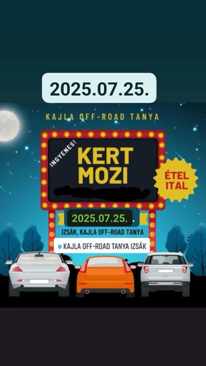 Kertmozi a Kalja Off-Road Tanyán 2025-07-18 Izsák, Kajla Off-Road Tanya, 2025. július 25. 21:00 - 23:59 Facebook esemény