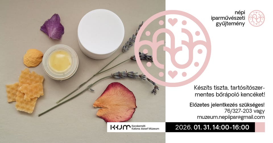 Készíts tiszta, tartósítószermentes bőrápoló kencéket 2026-01-14 Kecskemét, Népi Iparművészeti Gyűjtemény, 2026. január 31. 14:00 - 16:00 Facebook esemény