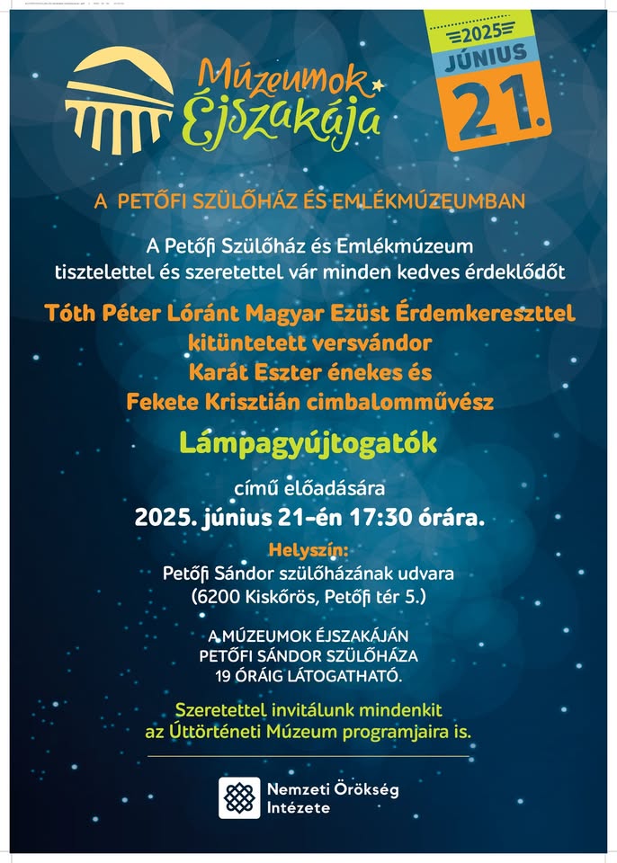 A Petőfi Szülőház és Emlékmúzeum tisztelettel és szeretettel vár minden kedves érdeklődőt 2025. június 21-én 17:30 órára