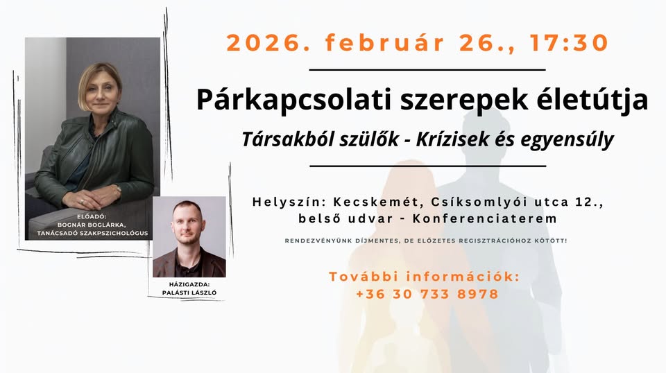 Párkapcsolati szerepek életútja: Társakbók szülők – Krízisek és egyensúly 2026-02-16 Kecskemét, Csíksomlyói u. 12., 2026. február 26. 17:30 - 19:00 Facebook esemény