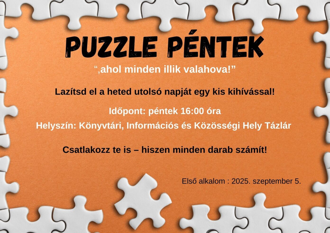 A könyvtár szeretettel meghív minden érdeklődőt kísérleti jelleggel induló Puzzle Péntek programjára, amely szeptember 5-től három hónapon keresztül, minden pénteken 16:00 órától kerül megrendezésre.