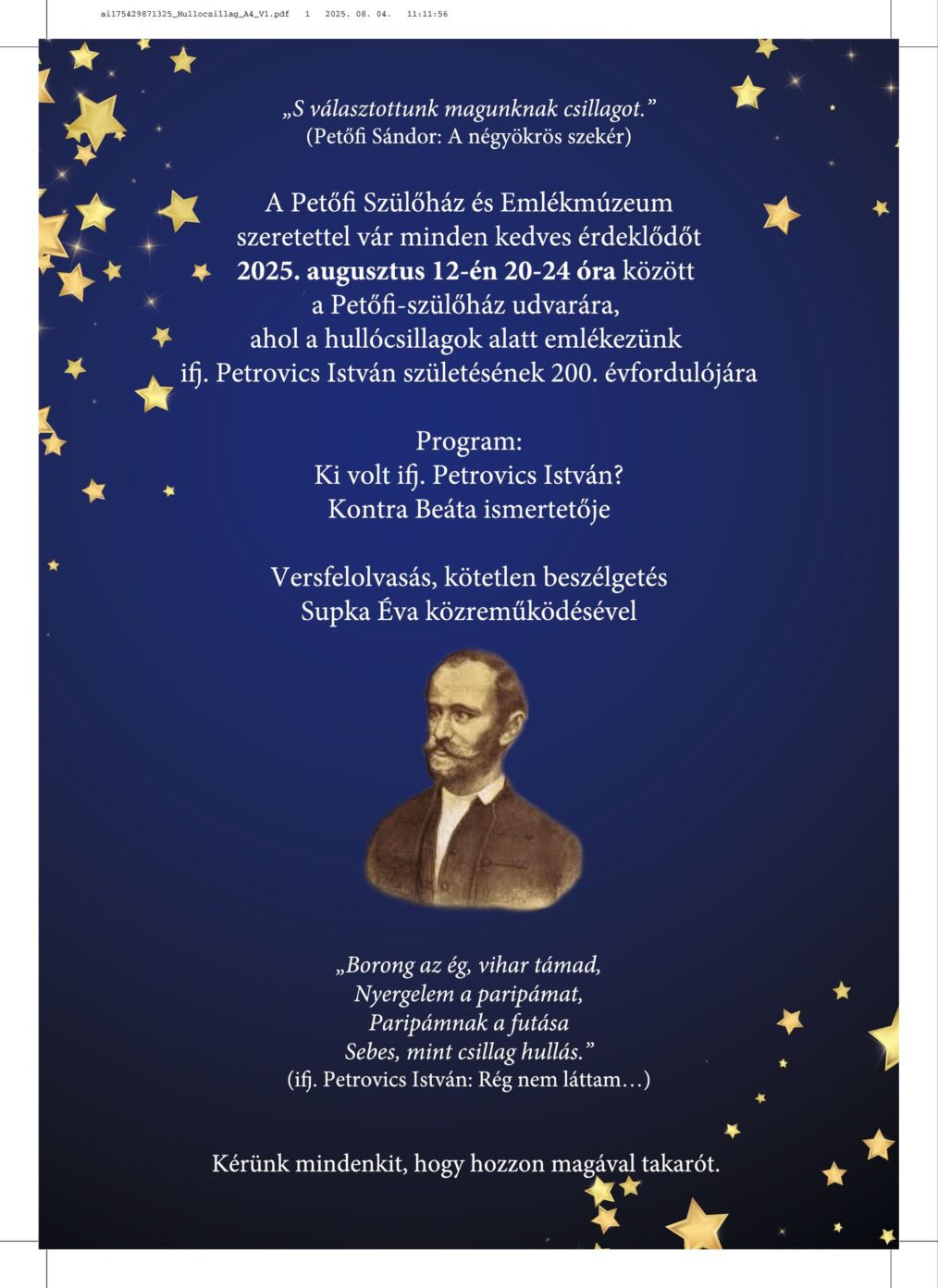 Kiskőrös, Petőfi-szülőház udvara, Petőfi tér 5. , 2025. augusztus 12. 20:00 - 23:59
