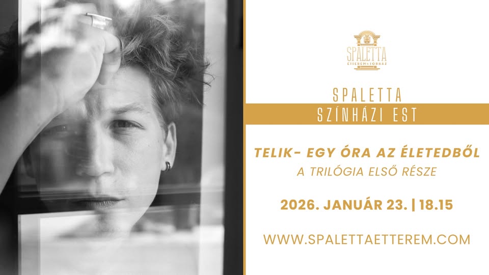 Spaletta Színházi Est: Telik – Egy óra az életedből 2026-01-09 Kecskemét, Spaletta Étterem és Sörház, 2026. január 23. 18:15 - 20:45 Facebook esemény
