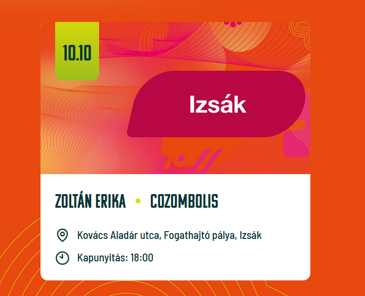 Szerencsekoncert – Zoltán Erika, Cozombolis 2025-09-23 Izsák, Fogathalytó pálya, 2025. október 10. 18:00 - 20:00