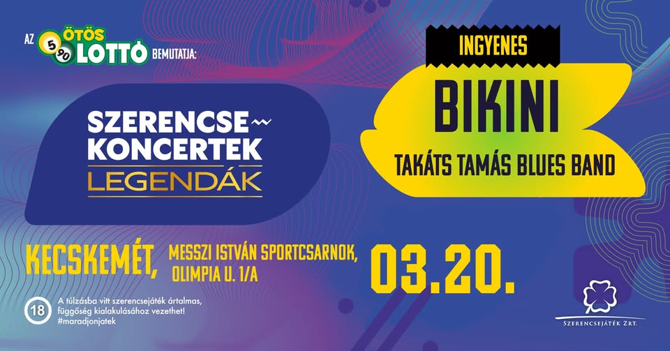 Szerencsekoncertek – Bikini, Takáts Tamás Blues Band 2026-03-12 Kecskemét, Olimpia utca 1/a. , 2026. március 20. 16:15 - 19:00 Facebook esemény