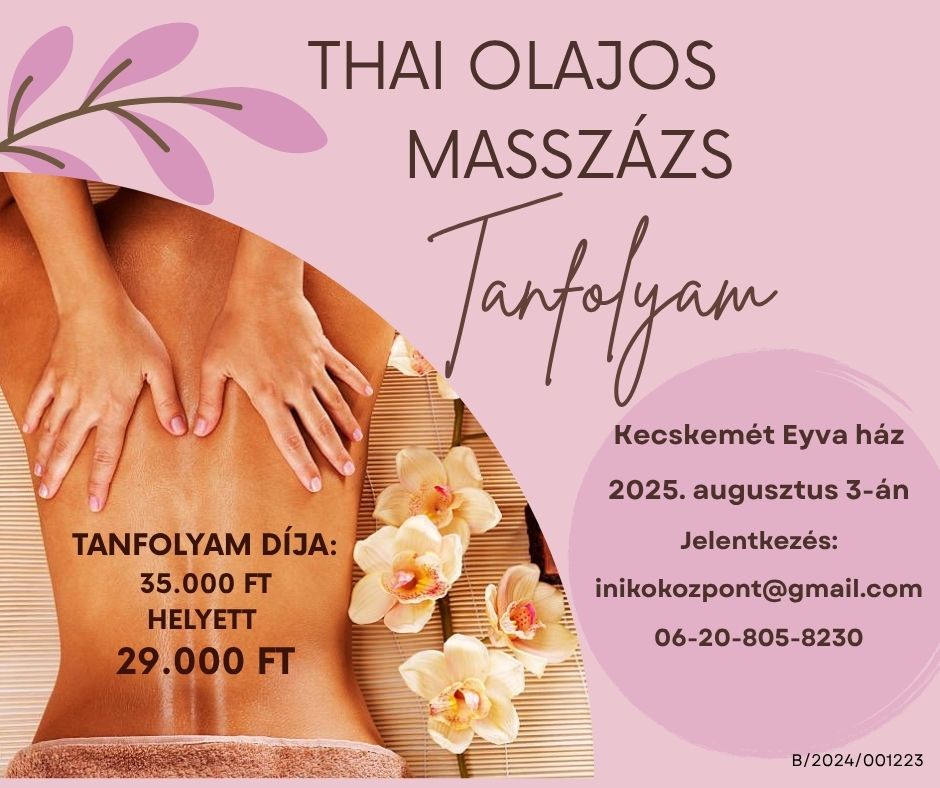 Thai olajos masszázs tanfolyam 2025-07-11 Kecskemét, EYVA Ház, Hoffman János utca 10., 2025. augusztus 3. 09:00 - 17:00 Facebook esemény